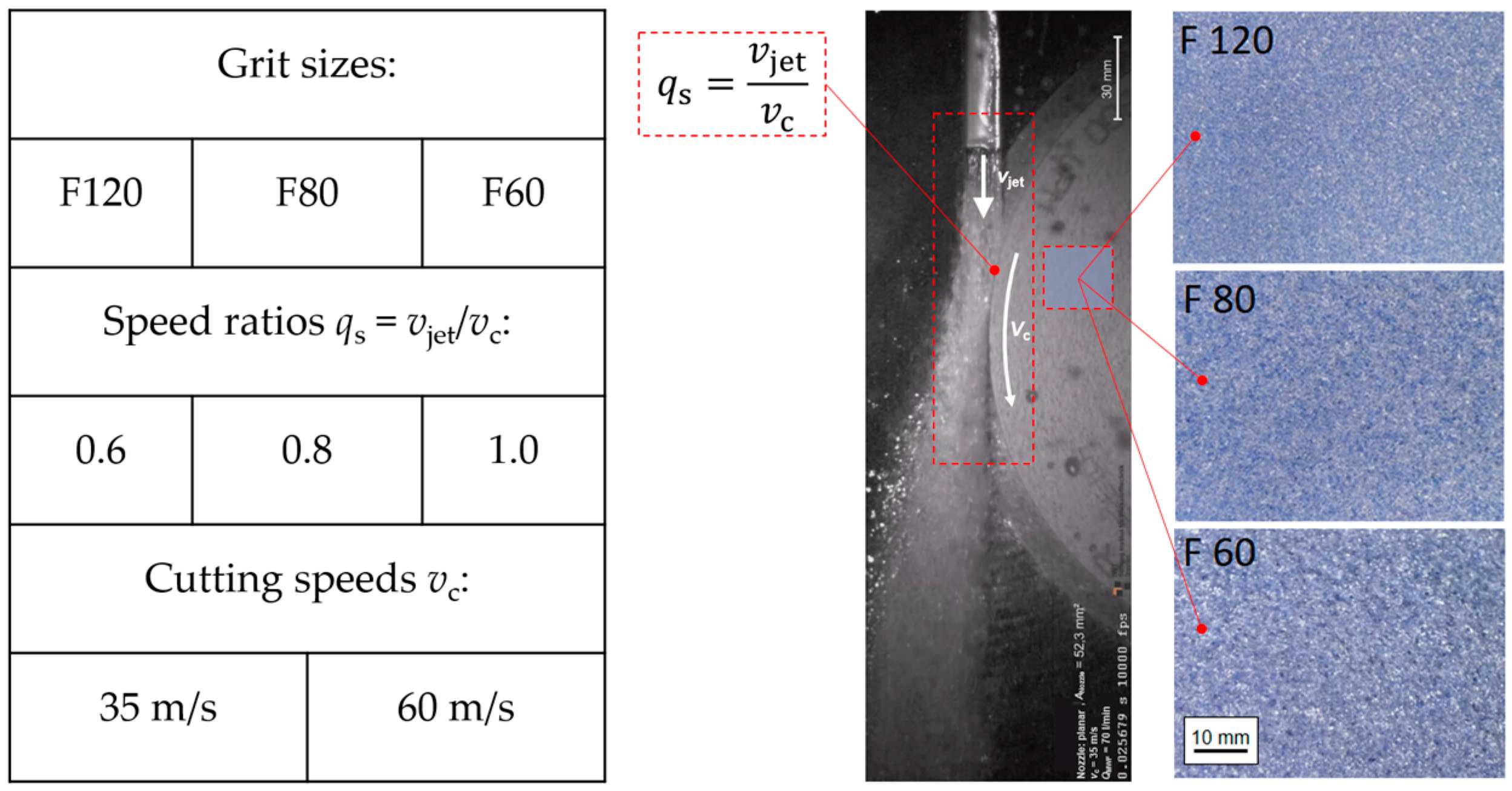 However, the topography and the pore structure of different grinding wheel specifications are not considered in these recommendations (e.g., open-pored ceramic corundum wheels with grit sizes F60, F80, or F120 grit sizes). Since wheel porosity, surface roughness, and air-barrier formation directly influence MWF entrainment, the interaction between the MWF jet and the wheel surface is expected to differ between wheel specifications. Furthermore, insufficient research has been conducted on determining the most efficient speed ratio at higher cutting speeds (e.g., 60 m/s), under constant conditions of the jet shape and nozzle positioning.