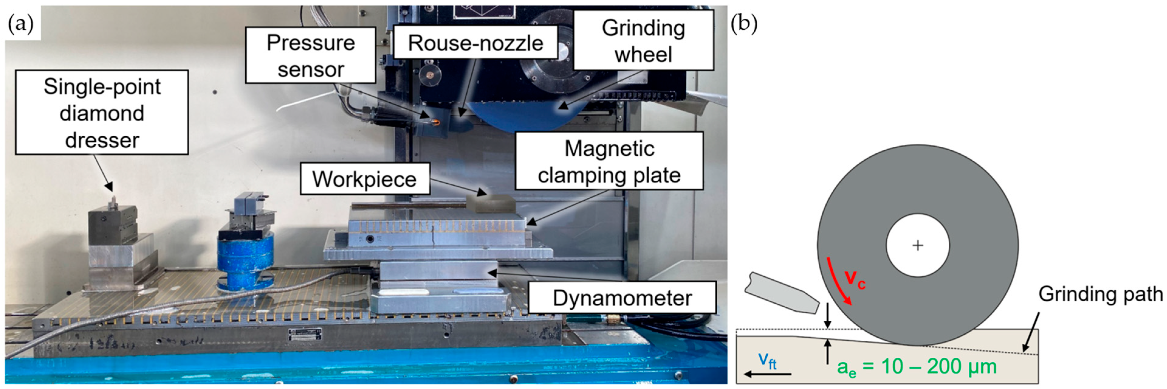 HNozzle dimensions were minimal, with maximum differences of 1.46 mm and 0.066 mm, respectively. These minor variations correspond to a maximum change in jet velocity of only 0.05 m/s, which is negligible for this study. All grinding tests were carried out on the surface grinding machine Blohm Profimat 412 HSG (Blohm Jung GmbH, Hamburg, Germany), as shown in