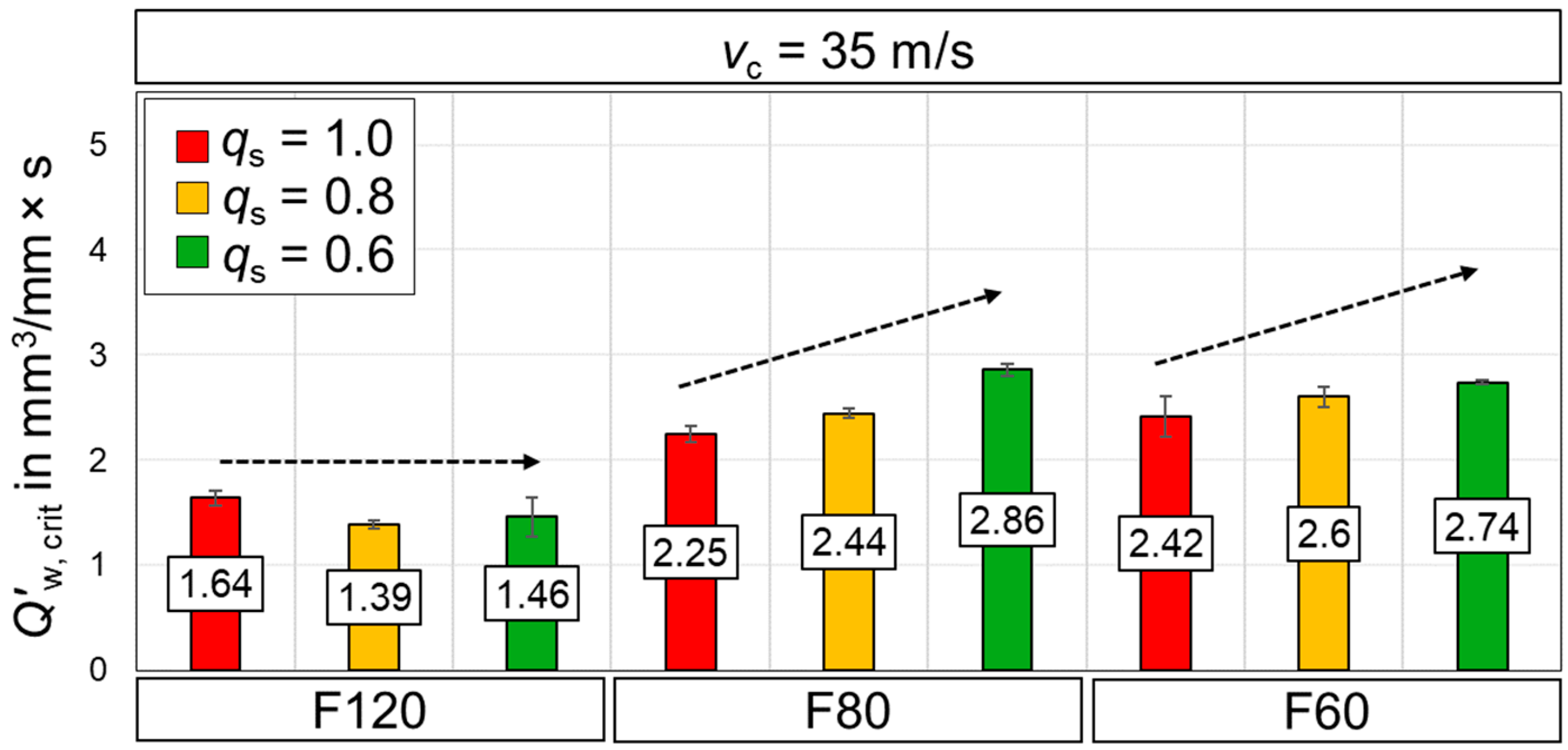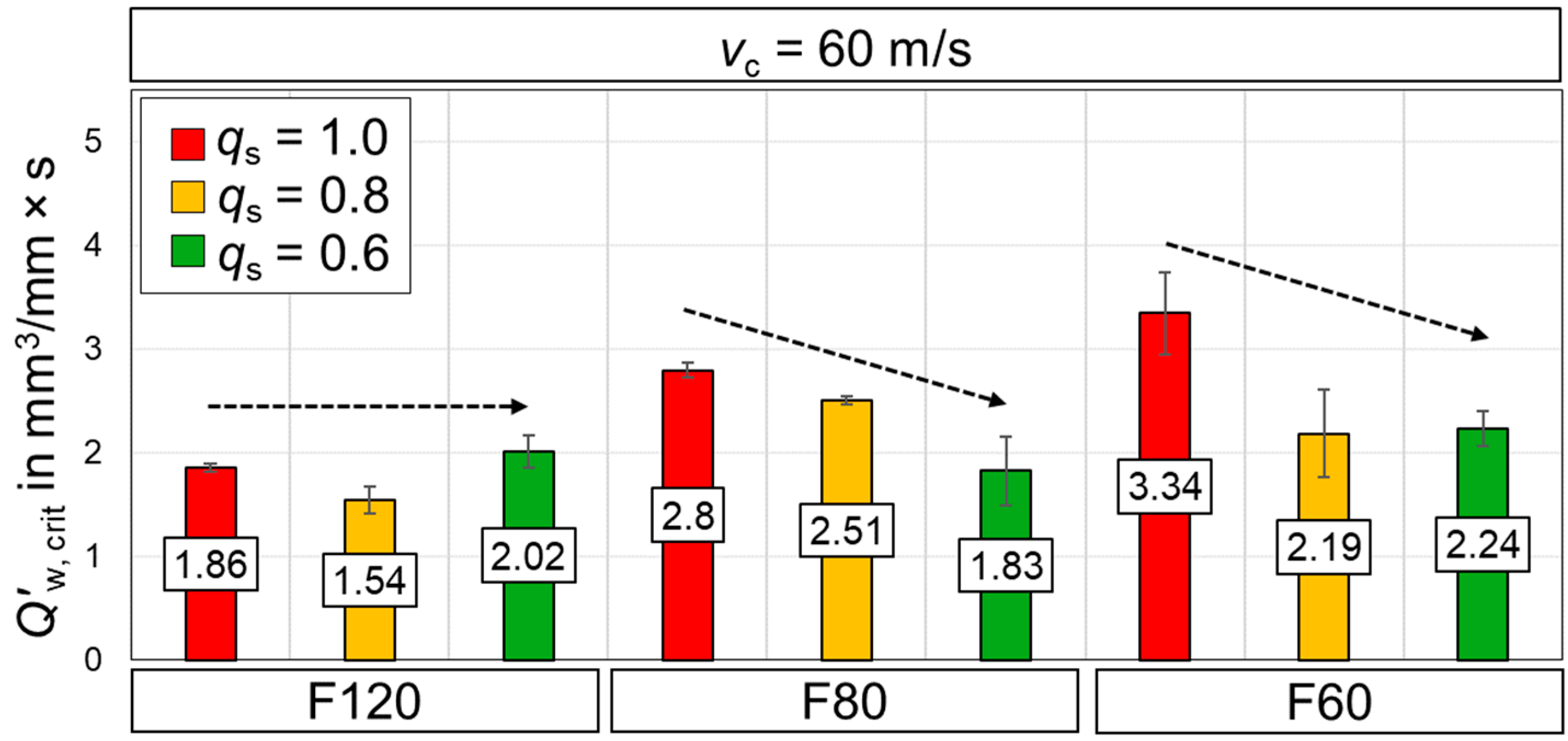 w, crit for coarser wheels (F80 and F60) due to improved MWF entrainment, whereas at 60 m/s the trend reverses as slower jets are deflected by an intensified air barrier. Fine grit wheels (F120) show no systematic dependency of