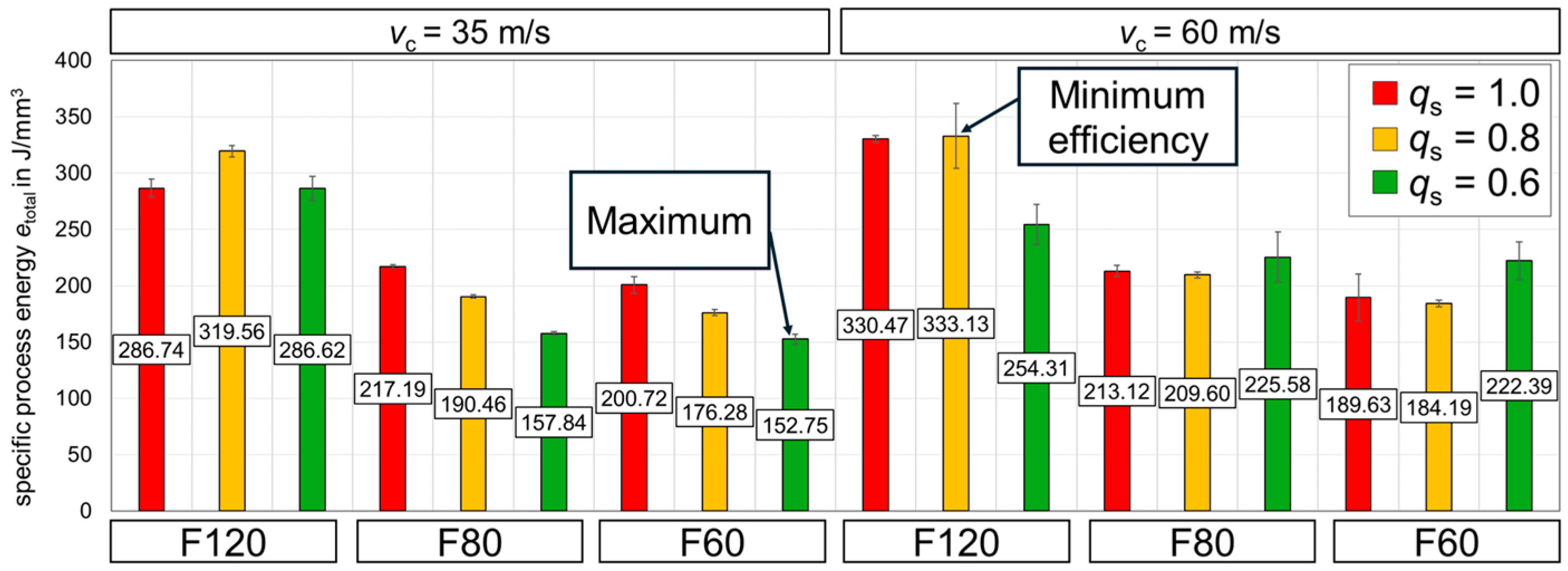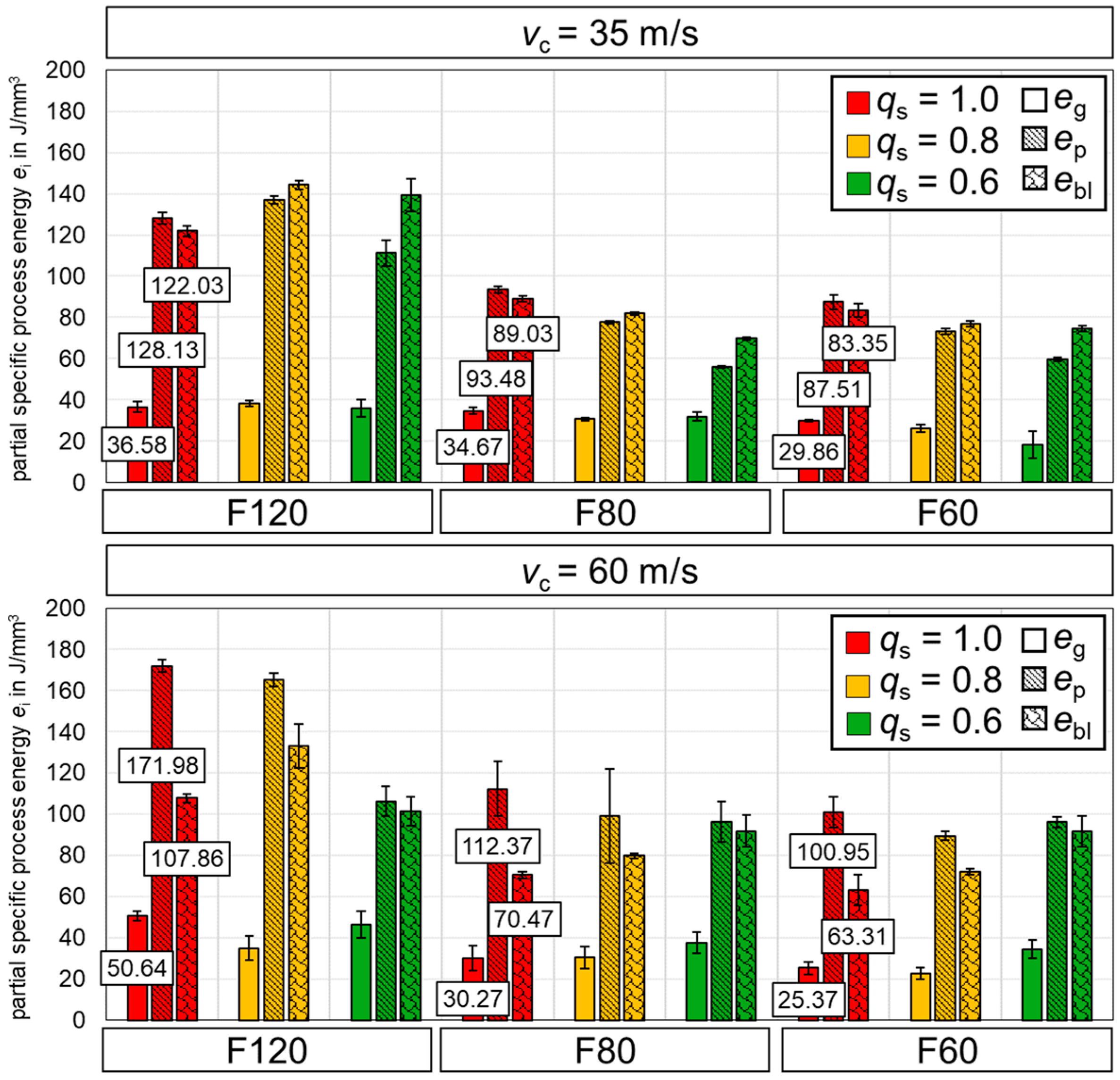 qs on specific grinding energy with respect to grinding wheel specification, two sets of experiments were conducted. The first series examined different grit sizes (F120, F80, F60) at a conventional cutting speed of