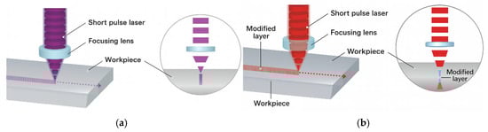 (a) Laser slicing (ablation) (focused spot size: 1–20 μm typically and 5–20 μm for faster processing), (b) stealth dicing (SD) (focus spot size: 1–5 μm for stealth dicing). (arrow represents scanning direction).
