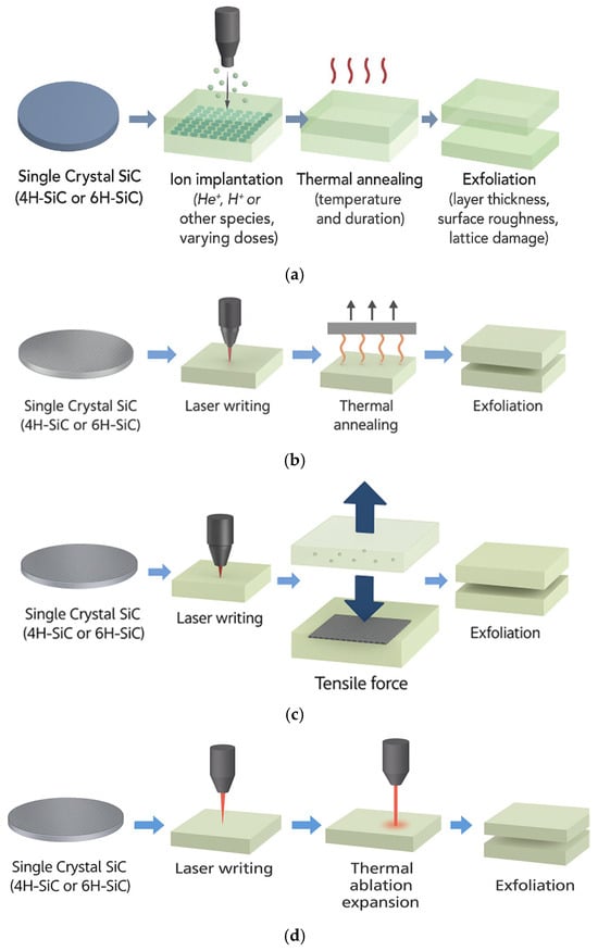 Traditional exfoliation methods such as wire sawing offer scalability but suffer from low material yield due to substantial kerf loss during the cutting process (Figure 1a). In particular, the kerf loss caused by the wire and slurry in these processes can reach approximately 250 μm [10]. Wire sawing technologies—primarily multi-wire slurry sawing and diamond wire sawing—are the most widely used methods for slicing SiC wafers, offering relatively high throughput and production efficiency [11]. However, these methods face limitations in achieving ultra-thin wafers, necessitating additional post-processing steps such as grinding and polishing to reach the desired thickness. Moreover, many SiC wafer products exhibit poor quality due to damage defects and residual stress introduced during contact-based machining processes. Specifically, electroplated diamond wire sawing often leads to subsurface microcrack damage and significant stress, which compromises wafer integrity [12,13]. Additionally, the sawing of SiC single crystals containing void defects can further exacerbate stress concentration and surface irregularities [13]. Similar issues have also been observed in silicon-based materials, where residual stresses induced by wire sawing and casting negatively affect wafer flatness and structural reliability [14]. These challenges underline the need for non-contact or minimally invasive slicing technologies to improve the quality and reliability of SiC wafers. As a result, considerable research efforts have been dedicated to developing advanced exfoliation techniques that minimize material loss while improving yield, with the goal of enabling more cost-effective and efficient SiC wafer production.