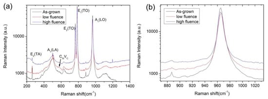 (a) Raman spectra of as-grown SiC and SiC samples implanted with He ions at high and low fluences. (b) Magnified view of the A1(LO) phonon peaks, highlighting spectral differences due to ion implantation. Adapted from You et al. [27].