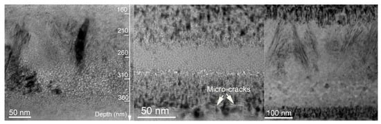 Cross-sectional transmission electron microscopy (XTEM) images of the damaged layer showing (from (left) to (right)): bubble formation, micro-cracks, and dislocations. Adapted from You et al. [27].