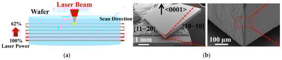 (a) schematic illustration of the stealth dicing process, (b) SEM images of separated SiC chips, highlighting differences in surface roughness along different crystallographic directions (as indicated with the arrow). Adapted from Yang et al. [22].
