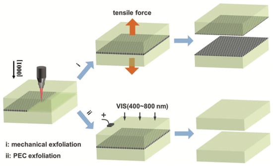 Schematic illustration comparing mechanical exfoliation (red arrows indicate force directions) and photoelectrochemical (PEC) exfoliation methods used for layer separation in SiC. (laser beam is in the [0001] crystalline direction) Adapted from Geng et al. [31].