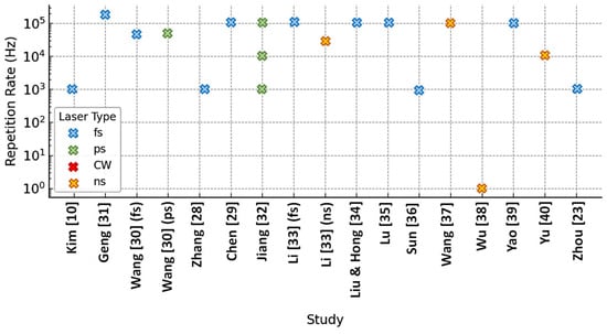 Table 22 summarizes how key laser parameters qualitatively influence physical responses in materials. Pulse width is a primary factor, with shorter (femtosecond/picosecond) pulses minimizing melting, heat-affected zones, roughness, and cracking due to “cool” non-thermal ablation, while longer pulses increase these thermal effects. Repetition rate introduces a cumulative thermal consideration; high rates can lead to heat accumulation, potentially increasing melting and stress regardless of pulse duration. Finally, the wavelength influences the light’s absorption depth and interaction mechanism with the material, which dictates how the energy is distributed and the specific type of damage or modification that occurs.