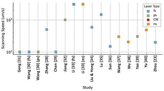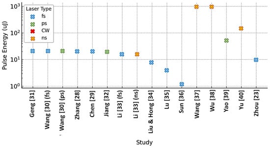 Wang et al. [30] investigated the structural characteristics and defect formation mechanisms associated with stealth dicing (SD) of 4H-SiC wafers using ultrafast lasers—specifically femtosecond (270 fs) and picosecond (10 ps) pulses (see Table 6). Ultrafast pulsed lasers are considered promising tools for semiconductor wafer processing due to their high precision and minimal thermal damage. The study aimed to understand the underlying laser–material interactions by analyzing nonlinear refractive index behavior, laser beam propagation, energy absorption, electron concentration dynamics, and energy deposition in 4H-SiC.