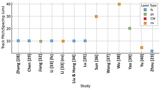 Zhang et al. [28] emphasized that, among the two primary types of SiC—N-doped and semi-insulating—the latter is gaining increasing attention due to its relevance in 5G applications. Despite this, relatively few studies have investigated the laser slicing of semi-insulating SiC. In their work, the authors employed a femtosecond (fs) laser with a pulse duration tunable into the picosecond (ps) range to study the laser slicing process over a broad range of parameters, including pulse duration, pulse energy, scan speed, track separation, and layer depth (see Table 3).
