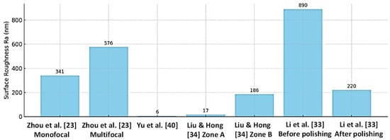 Li et al. [33] developed a hybrid laser processing method that integrates nanosecond laser slicing with femtosecond laser polishing to improve material utilization and surface quality in single crystal 4H-SiC wafer preparation. The study aimed to overcome the high material loss and mechanical damage associated with conventional wire-sawing and grinding by implementing a kerf-free laser slicing technique followed by precise laser polishing. Using a nanosecond laser (532 nm, 200 ns pulse width, 60 kHz) for slicing, an internal modified layer was created via capsule-shaped exploding holes and microcrack propagation, allowing wafer separation with a peeling force of approximately 3.6 MPa (see Table 9). The sliced surfaces exhibited fluvial morphologies with an average roughness over Sa 0.89 μm and clear crystalline–amorphous transitions, as confirmed by SEM, Raman, and HRTEM analyses. Subsequent femtosecond laser polishing (517 nm, 650 fs, 50 kHz) significantly reduced the surface roughness to Sa 0.22 μm and transformed the microstructure through re-melting, Si–C bond dissociation, and formation of 3C-SiC and SiO2 phases. Notably, laser-induced periodic surface structures (LIPSS) and amorphous layers were observed post-polishing, evidencing surface reconstruction driven by high thermal gradients and ultrafast cooling. The hybrid process achieved up to 75% reduction in material loss compared to conventional methods, while preserving single crystallinity and minimizing subsurface damage. This study demonstrates a promising route for high-efficiency, damage-minimized fabrication of SiC substrates for semiconductor applications.