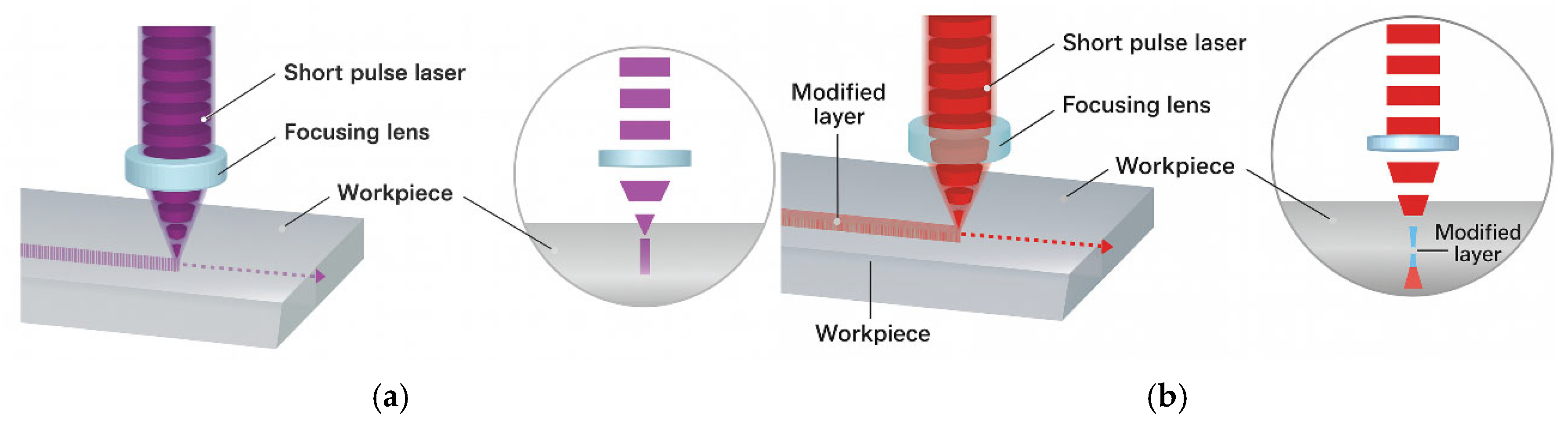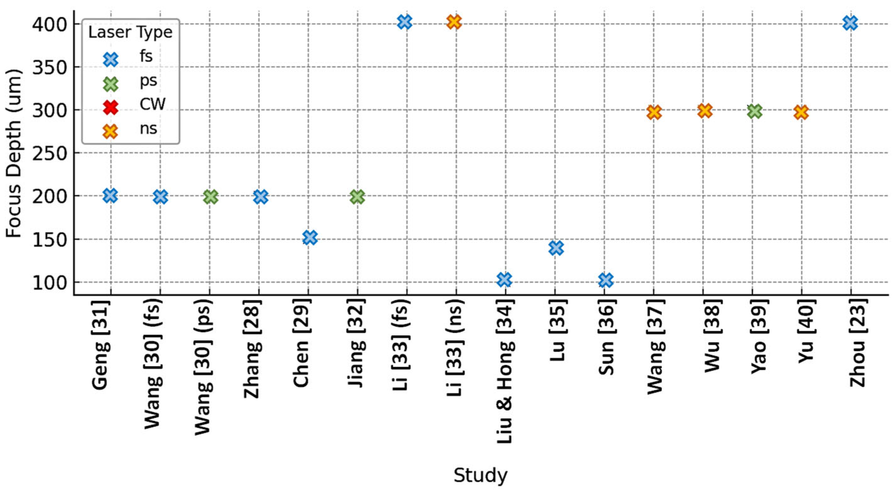 Figure 16). Femtosecond lasers often require tight focusing to achieve high peak intensities in localized regions, allowing for precise control over the modification zone.