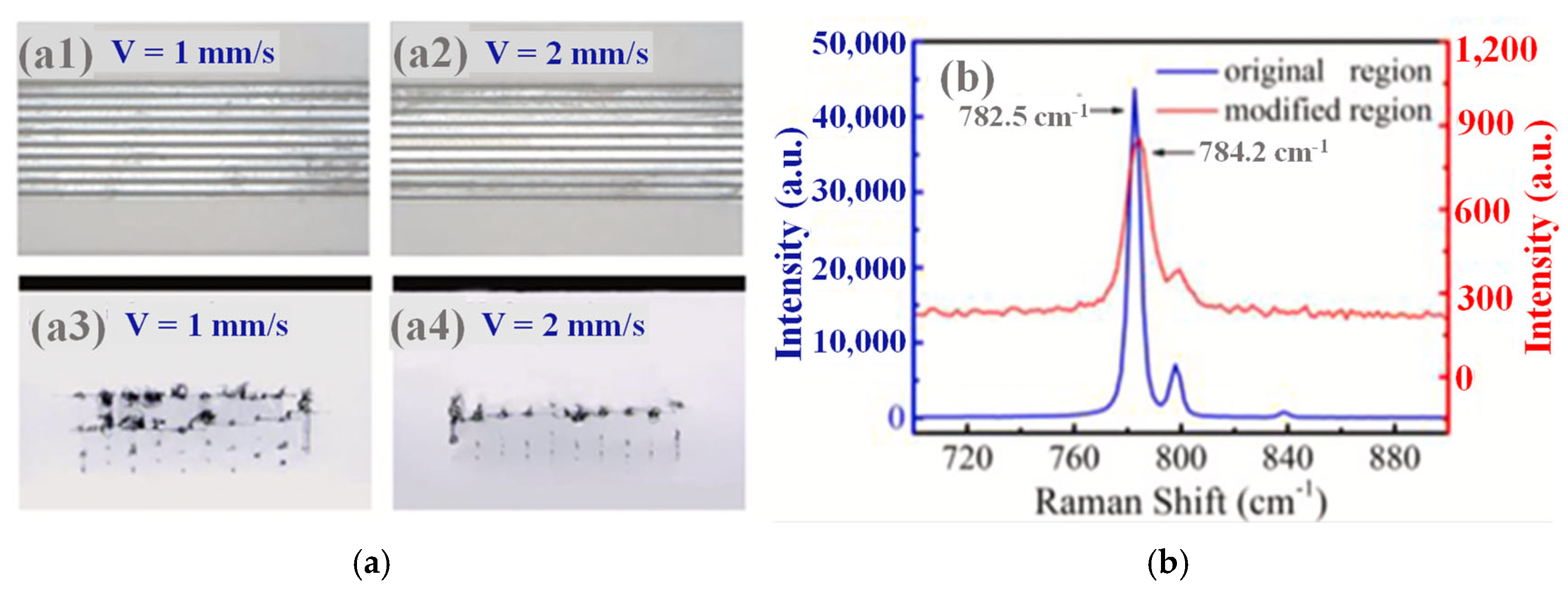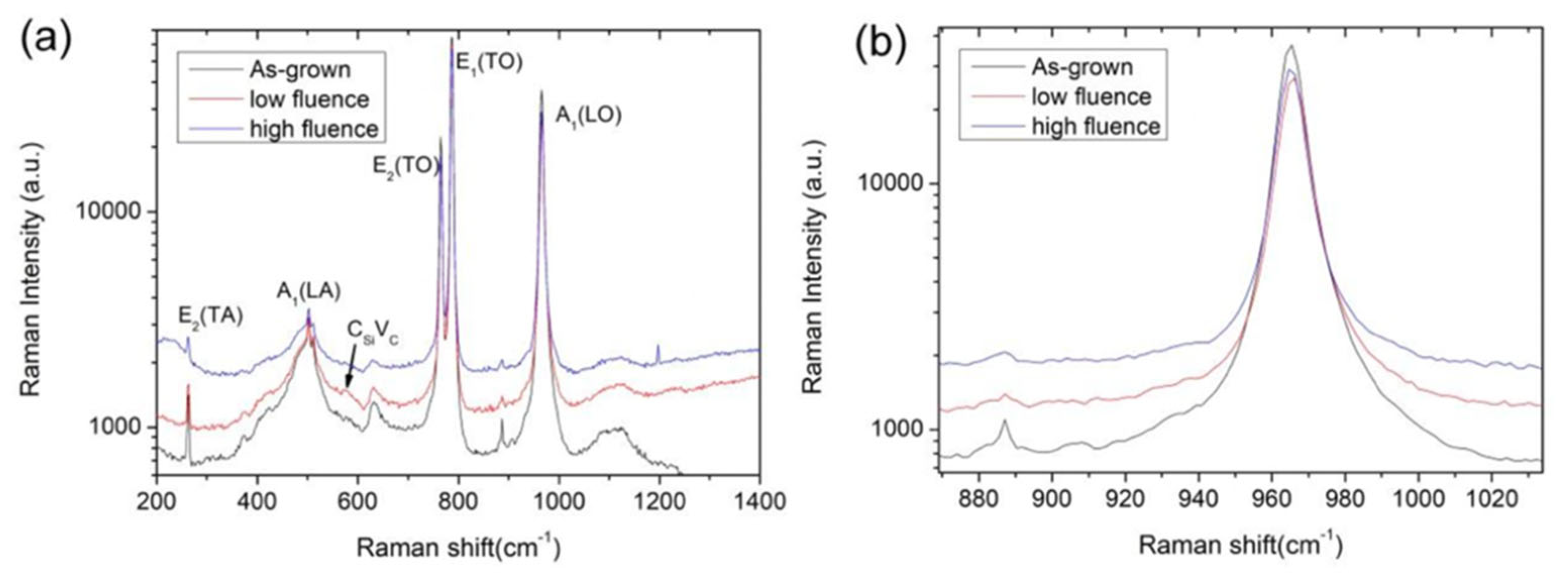 10], they observed that ps-duration laser pulses were more effective than fs pulses in forming modified layers. The resulting modified regions typically consisted of SiC with degraded crystallinity and the presence of amorphous carbon, as indicated by the emergence of G and D bands in Raman spectra (see