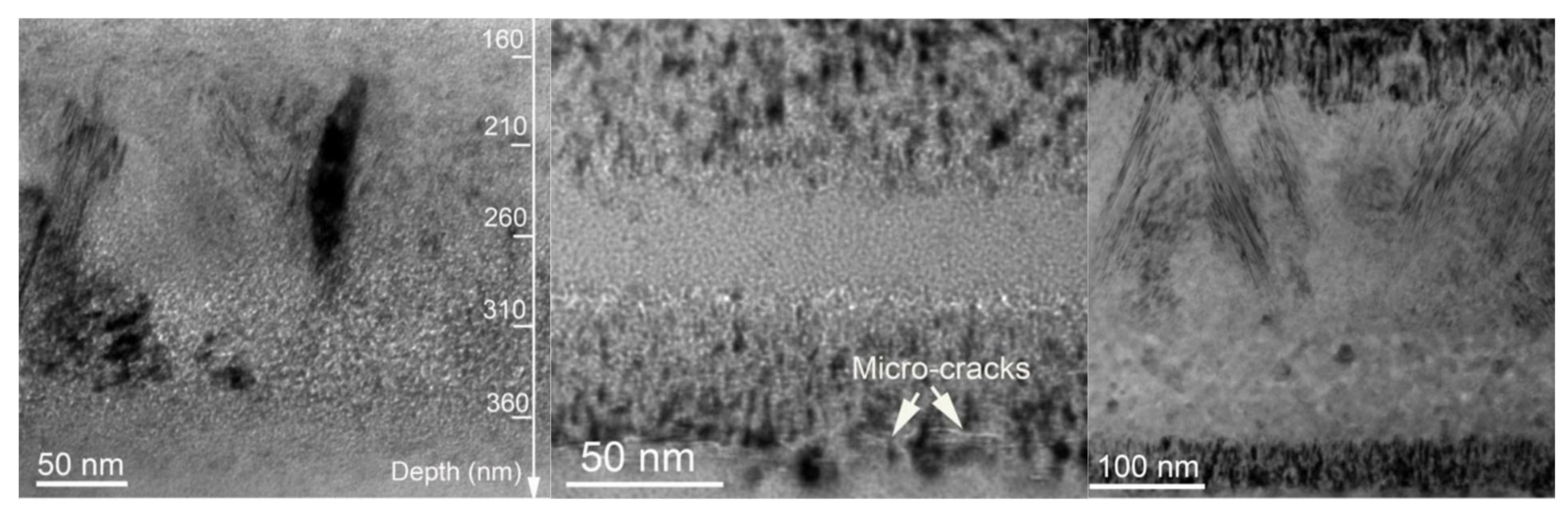 Figure 5), including lattice defects and bubble formation, were further examined using cross-sectional transmission electron microscopy (XTEM) and high-resolution transmission electron microscopy (HRTEM).