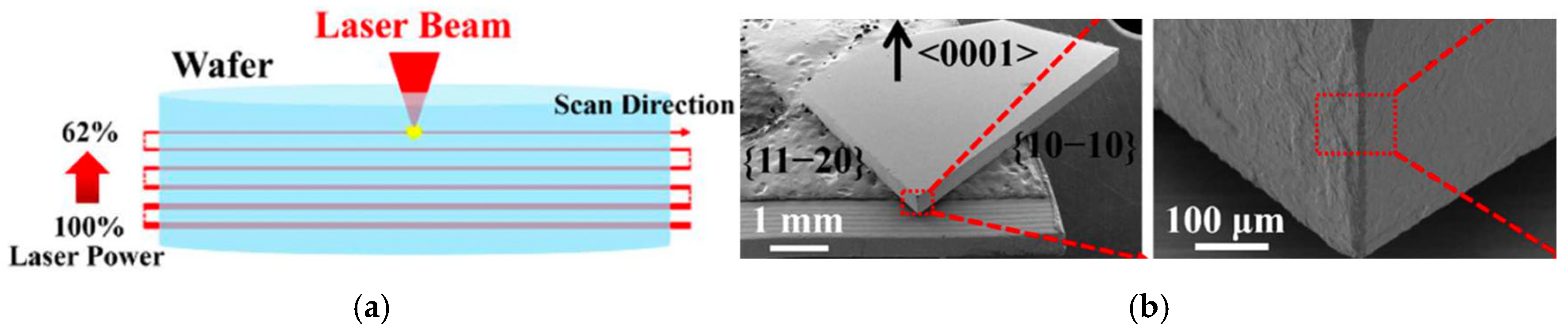 Figure 2a). Multiple damage tracks are inscribed with appropriate dot spacing side-by-side perpendicular to the exfoliation plane. Microcracks formed around these damage tracks intersect and propagate, creating larger cracks that allow the SiC layer to be mechanically separated after laser processing. Another related technique is stealth dicing, which shares a similar principle but differs in laser orientation (see