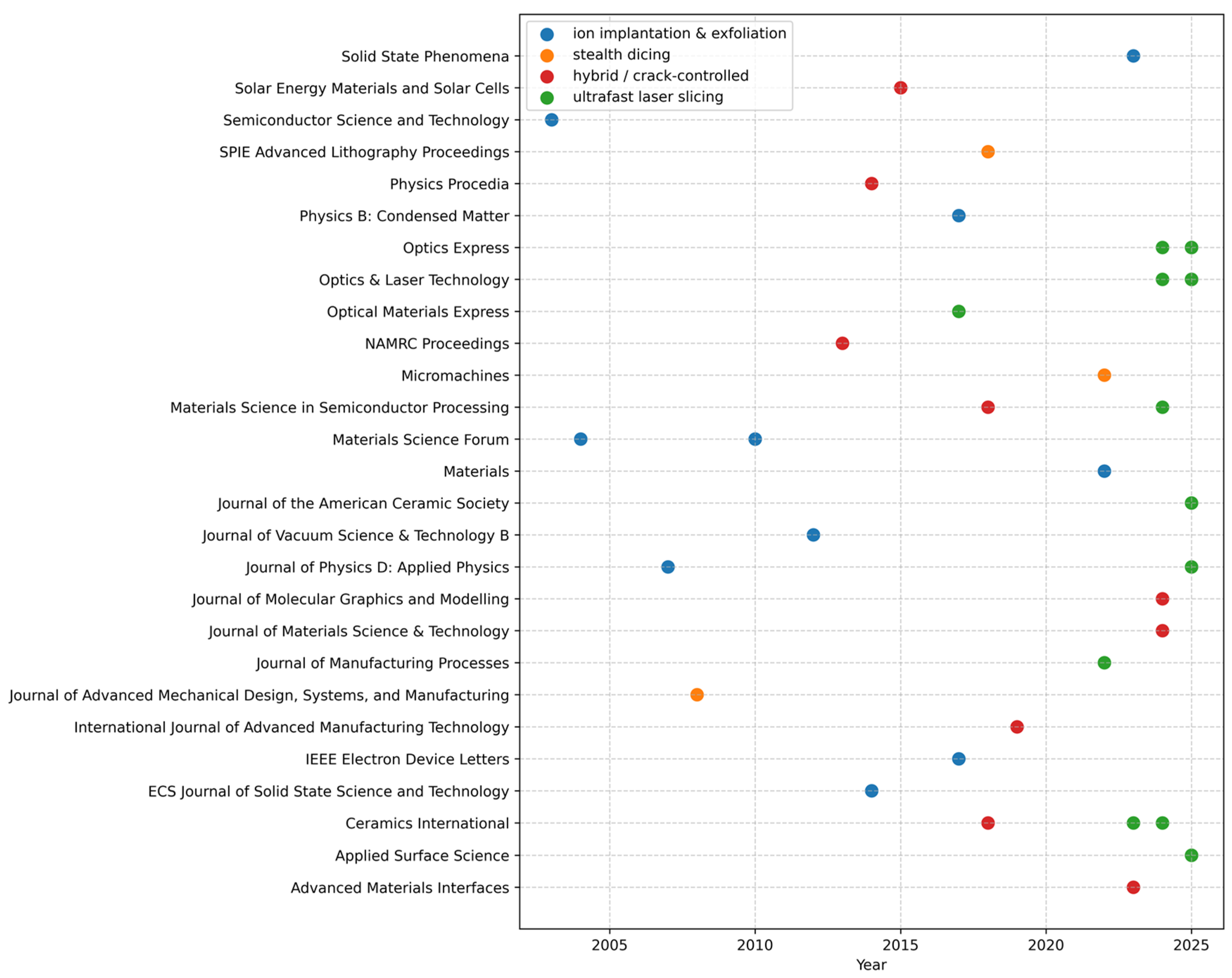Figure 11 visualizes the distribution of these research publications across various journals from 2003 to 2025. It highlights how different journals have contributed to the evolving field of SiC wafer slicing and processing technologies, with particular emphasis on advanced laser and exfoliation techniques.