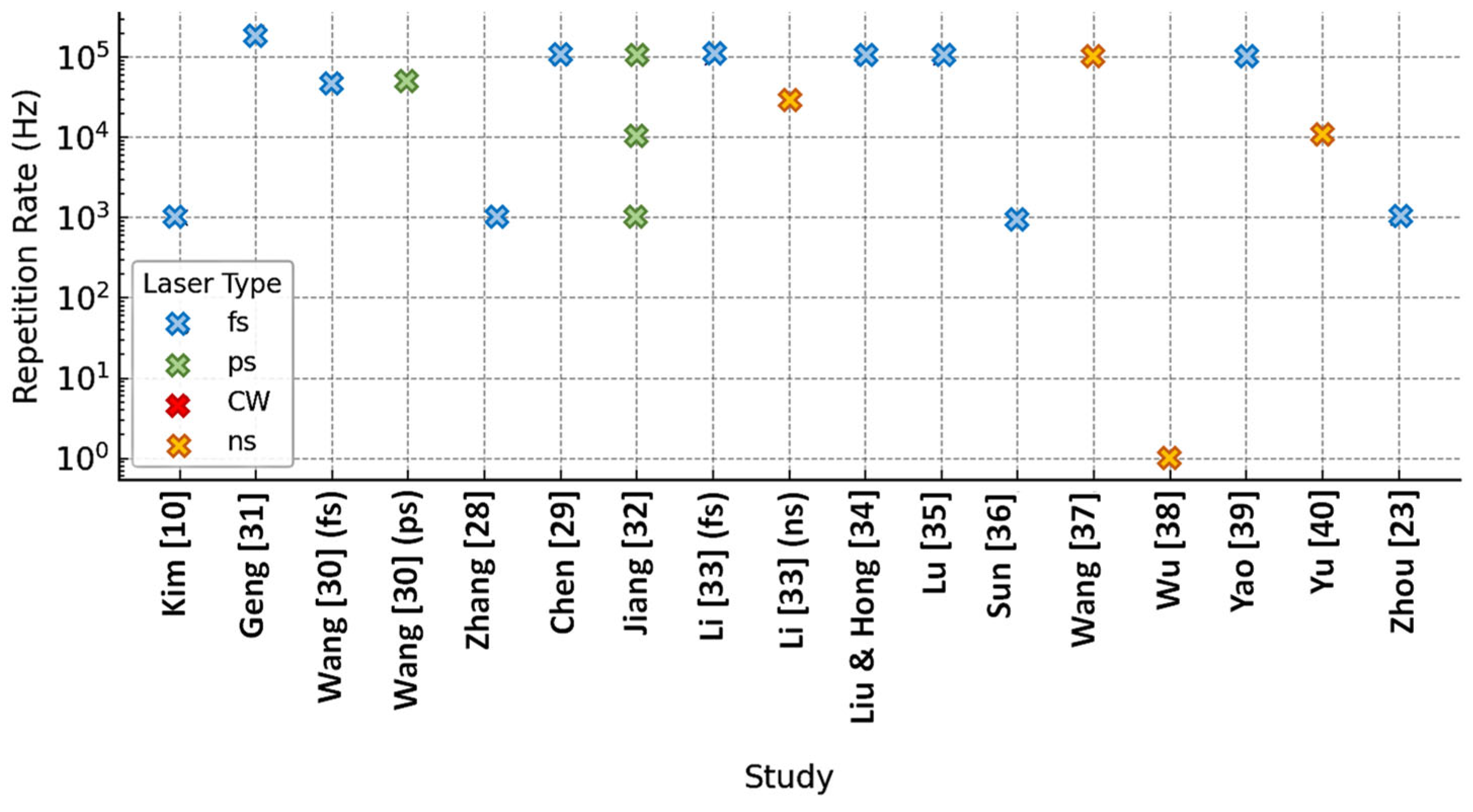 Figure 13). Femtosecond lasers generally operate in the range of 1 kHz to 200 kHz, supporting rapid scanning with moderate energy delivery. On the other hand, nanosecond lasers often function at very low repetition rates—sometimes as low as 1 Hz—allowing for the accumulation of higher pulse energy in each shot. This is particularly useful for creating large-scale modifications or for stealth dicing applications where thermal accumulation is acceptable.