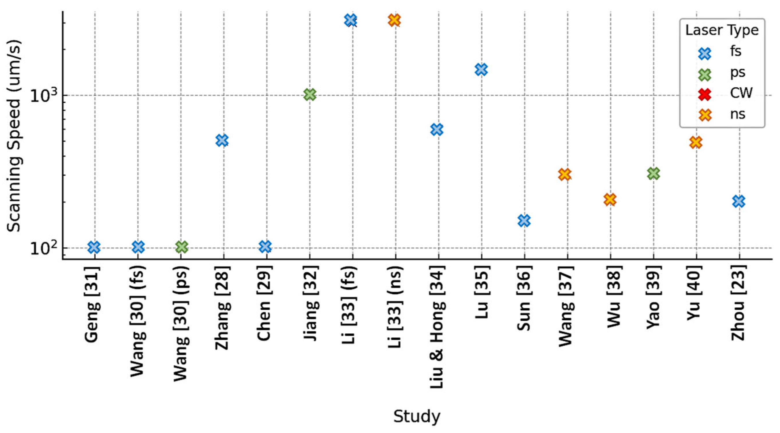 33] identified laser fluence as the dominant parameter affecting groove depth, width, heat-affected zone (HAZ), and material removal rate (MRR), while scanning speed influenced depth, width, and HAZ but not MRR, and repetition rate affected depth, HAZ, and MRR. Crystal orientation studies [