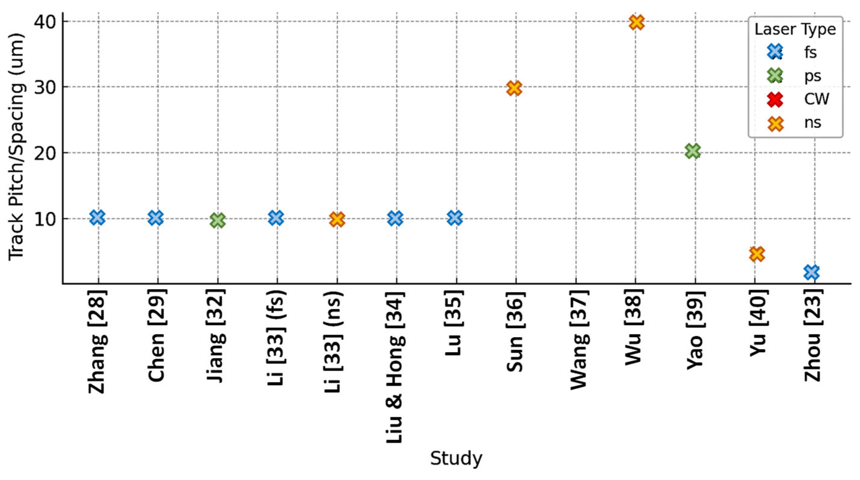 Figure 17). Nanosecond lasers, with their broader thermal diffusion profiles, often adopt coarser spacing, which suffices for applications that do not demand submicron accuracy.