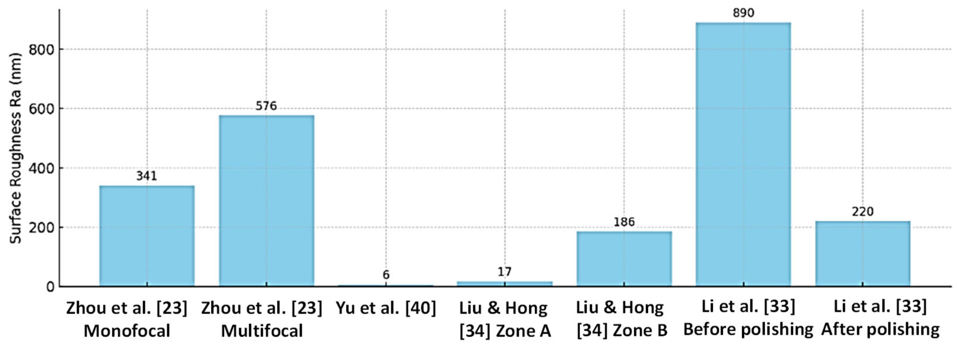 Figure 18 visualizes the cleaved surface roughness (Ra) from several key laser slicing studies. It compares results for monofocal vs. multifocal ultrafast laser methods, nanosecond laser slicing, and hybrid or zone-specific techniques. This helps highlight the trade-offs between surface quality and processing approaches. The surface quality achieved in various studies listed in
