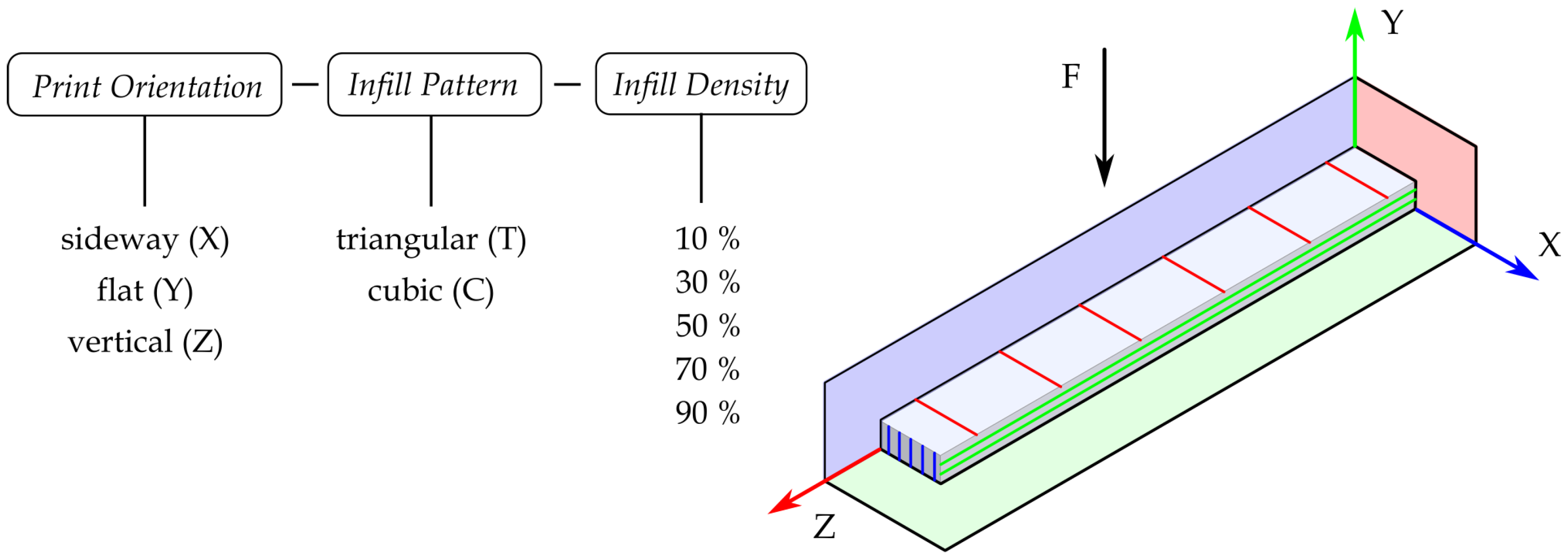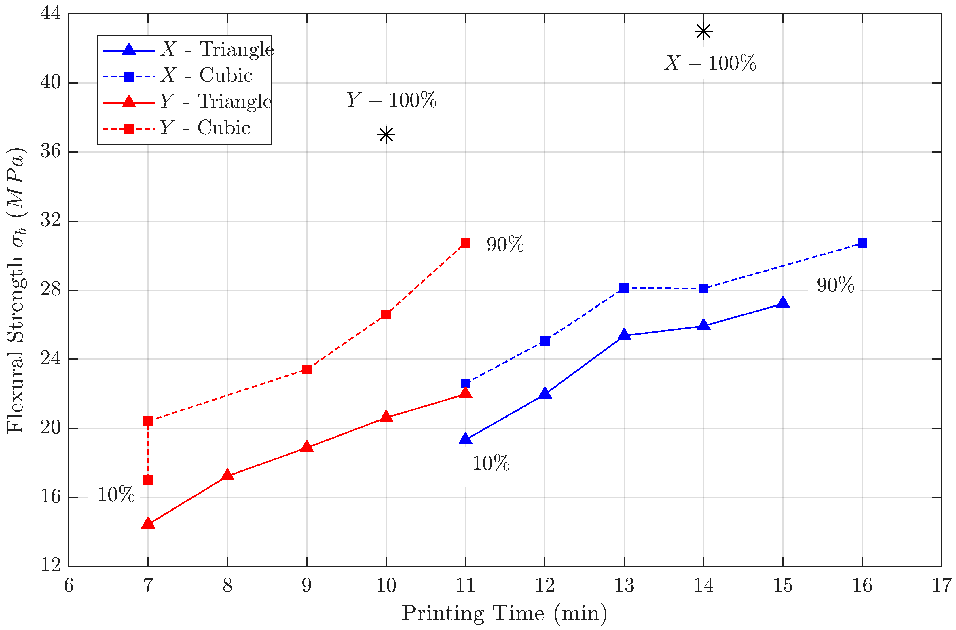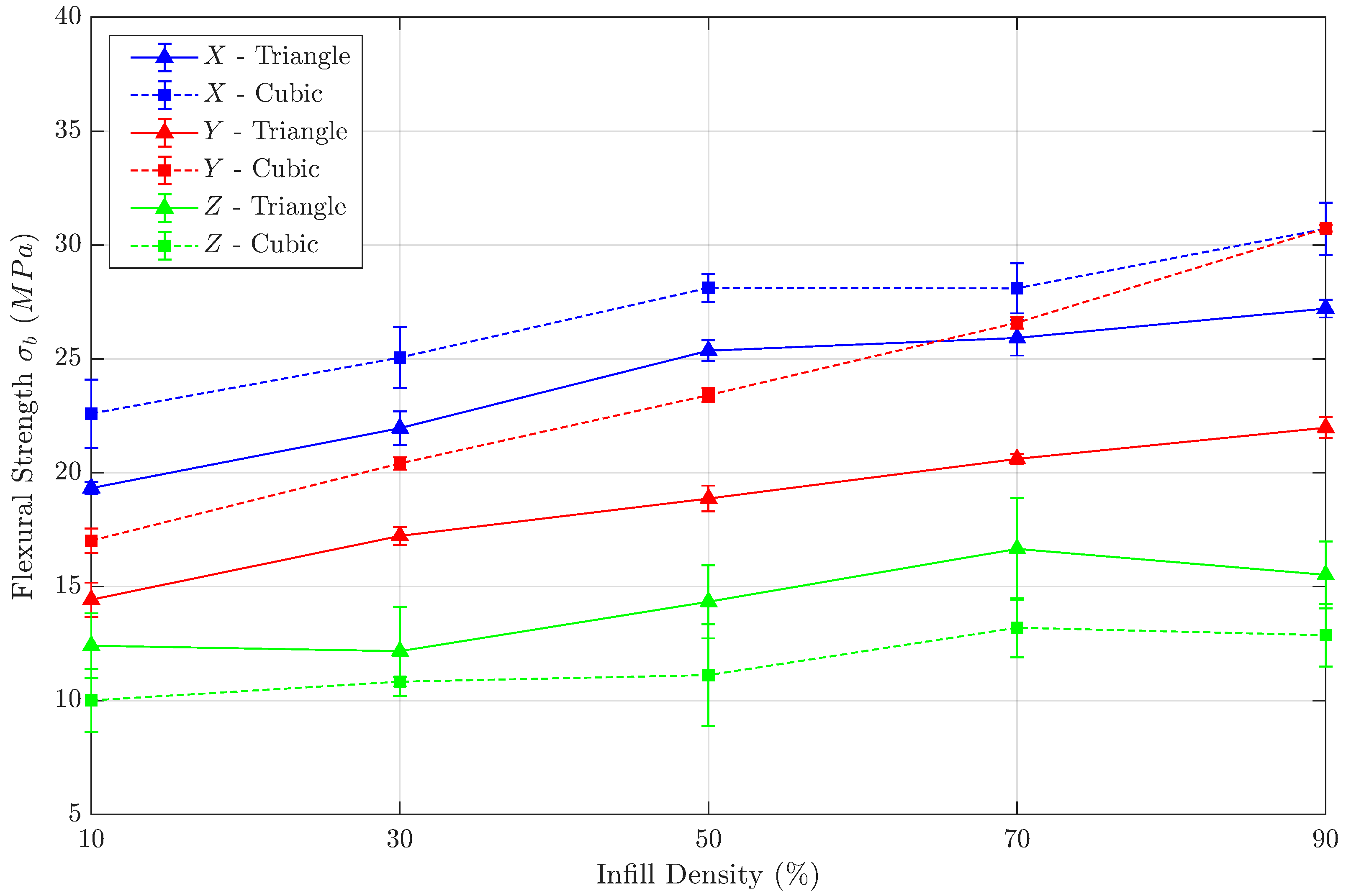 - Flexural strength for X- and Z-directions increase equally for both filling patterns as the infill density increases, whereas for samples in the Y-direction, flexural strength for the cubic pattern increases more strongly than for the triangular pattern.
