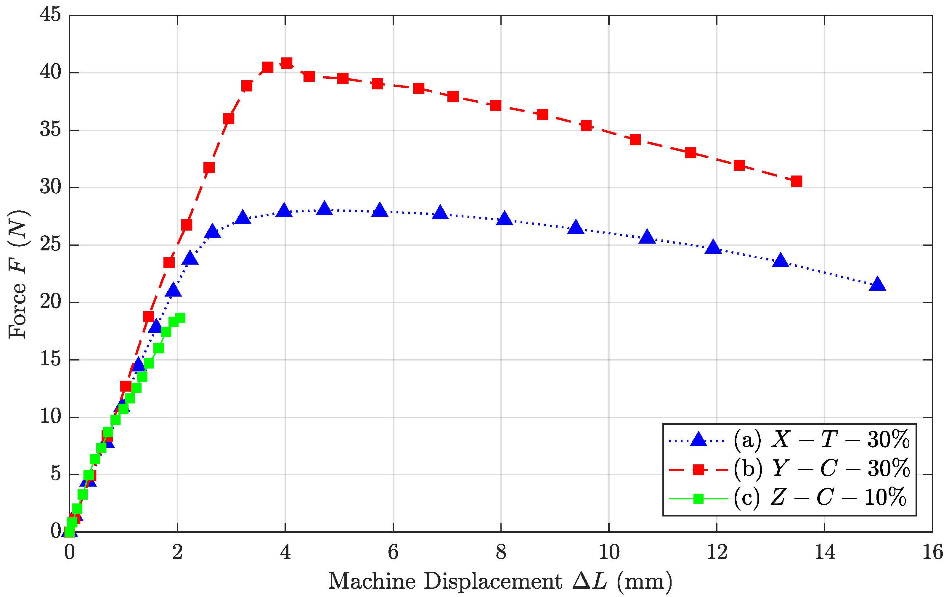 - Both X-printed patterns also displayed high performance at low infill densities. Up to an infill density of approx. 60%, the strength values for both infill patterns are even higher than those for the Y-C configuration. However, comparatively long printing times are a negative factor here.