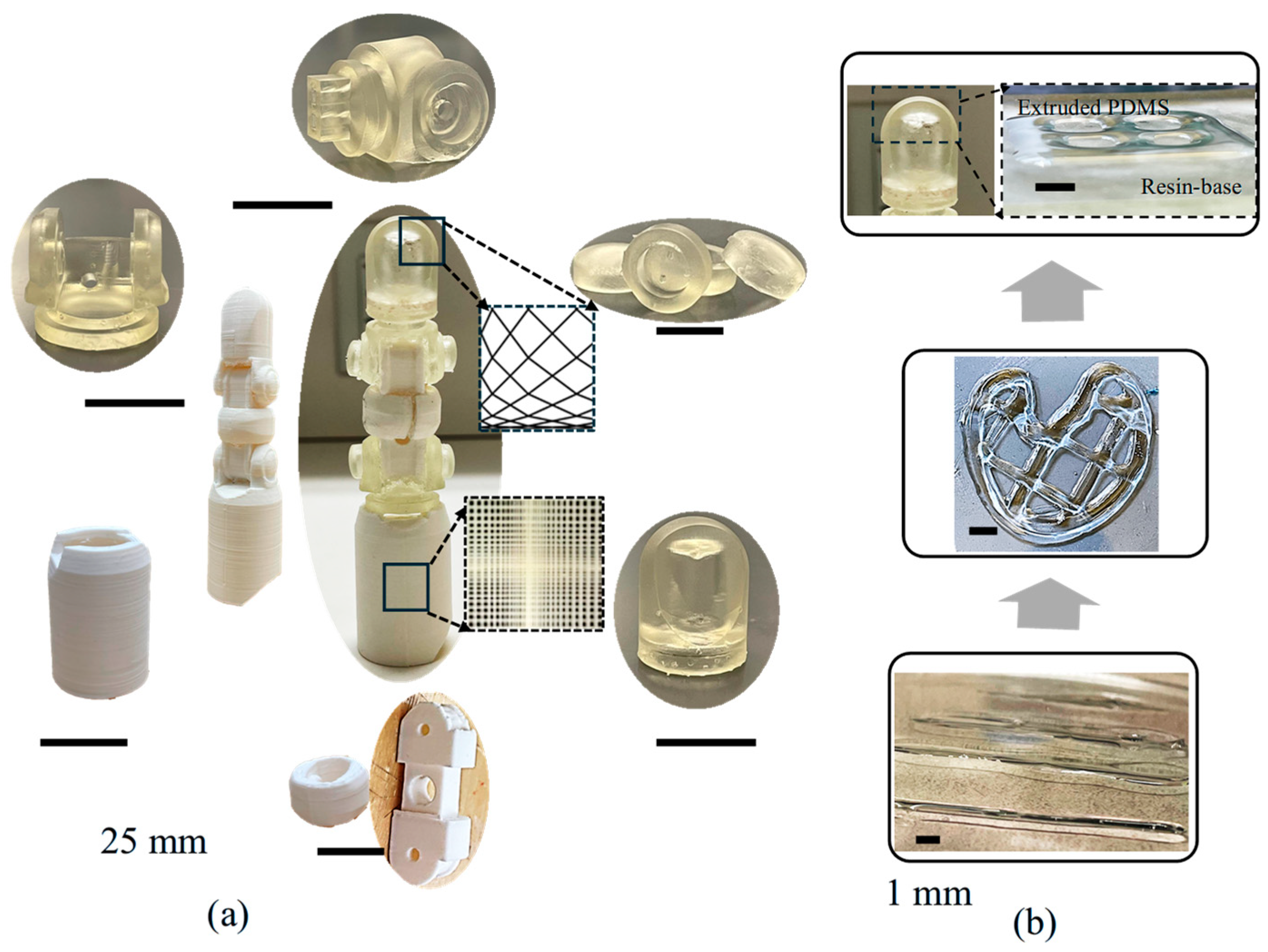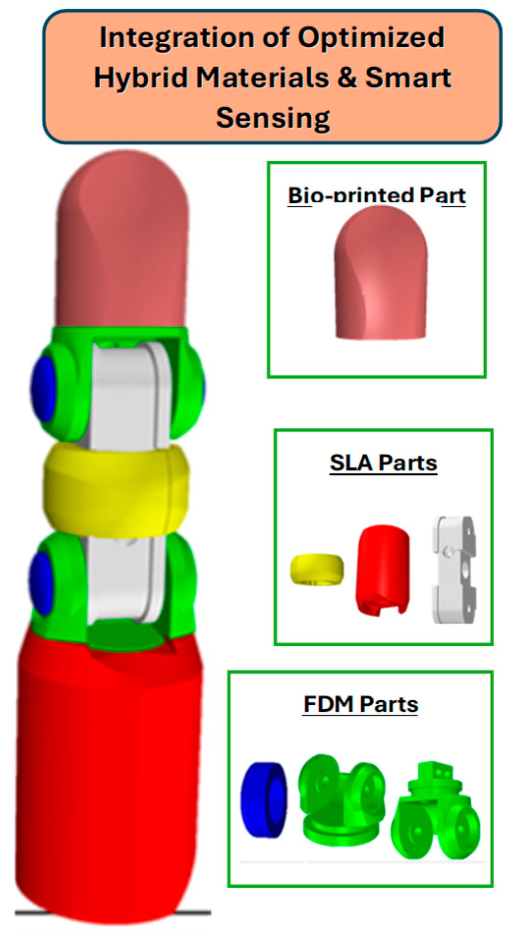 Prototype development of a multi-material 3D-printed finger prosthesis integrating SLA, FDM, and extrusion-based bioprinting (EBP) processes. (a) Overview of the assembled finger prosthesis and its individual components, highlighting the use of SLA for high-precision parts (finger plug, base, and middle-to-fingertip connector) and FDM for structural sections (socket, middle segment, and bumper). SLA fabrication consumed 5.16 mL of resin over 75 min, while FDM components were printed using 13 g of optimized PLA in 132 min. (b) Fabrication steps demonstrating material interfacing: optimized PDMS extrusion over SLA-printed fingertips and hybrid PDMS–hydrogel deposition, showcasing the feasibility of embedding soft sensing materials within rigid structures. The optimized PDMS retained strong surface interaction even four hours post-printing, confirming compatibility for tactile sensor integration.
