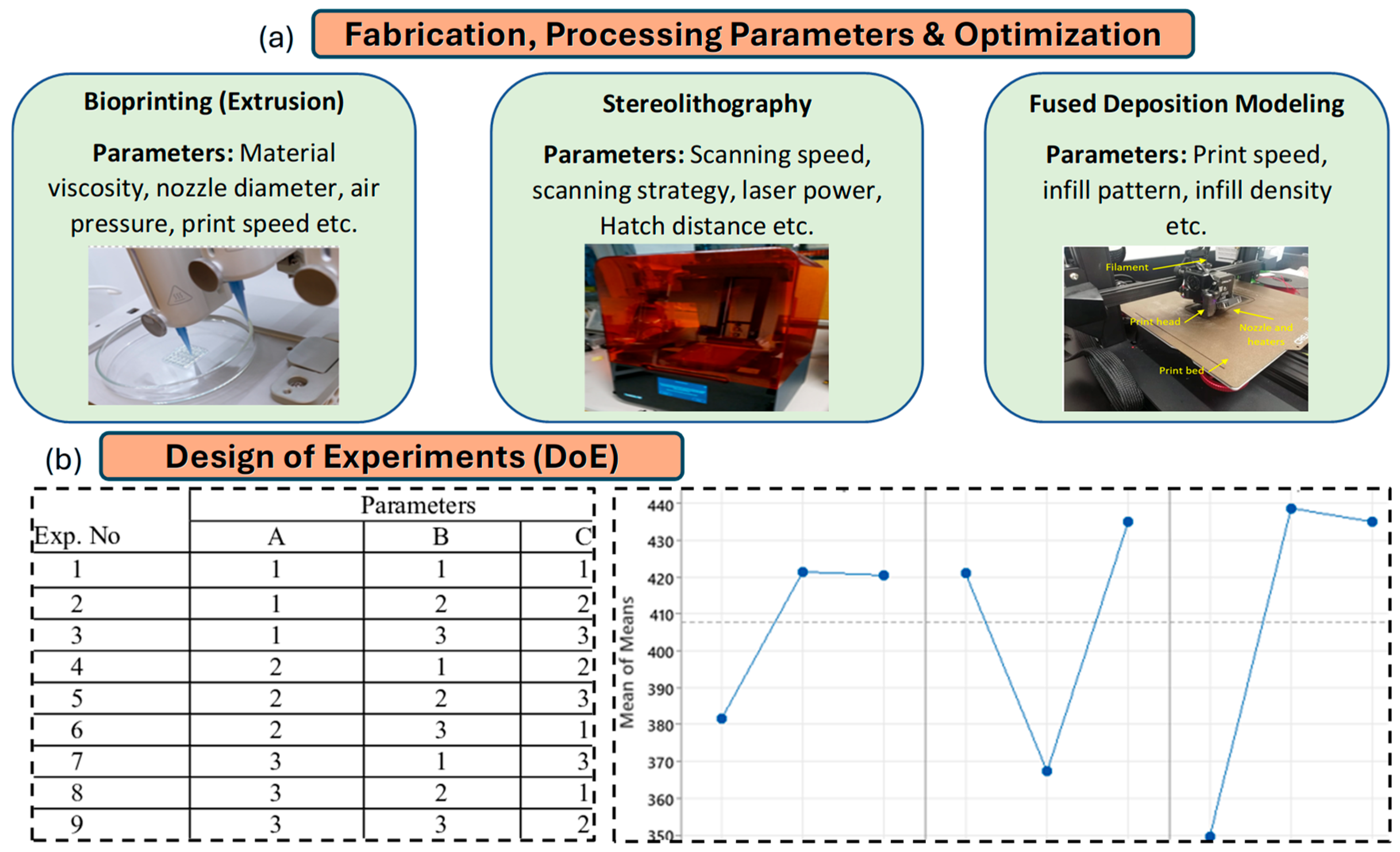 (a) Fabrication techniques with (b) process optimization highlights the use of design of experiments (DoE) and additive manufacturing methods, culminating in the development of a robust and responsive prosthetic finger.