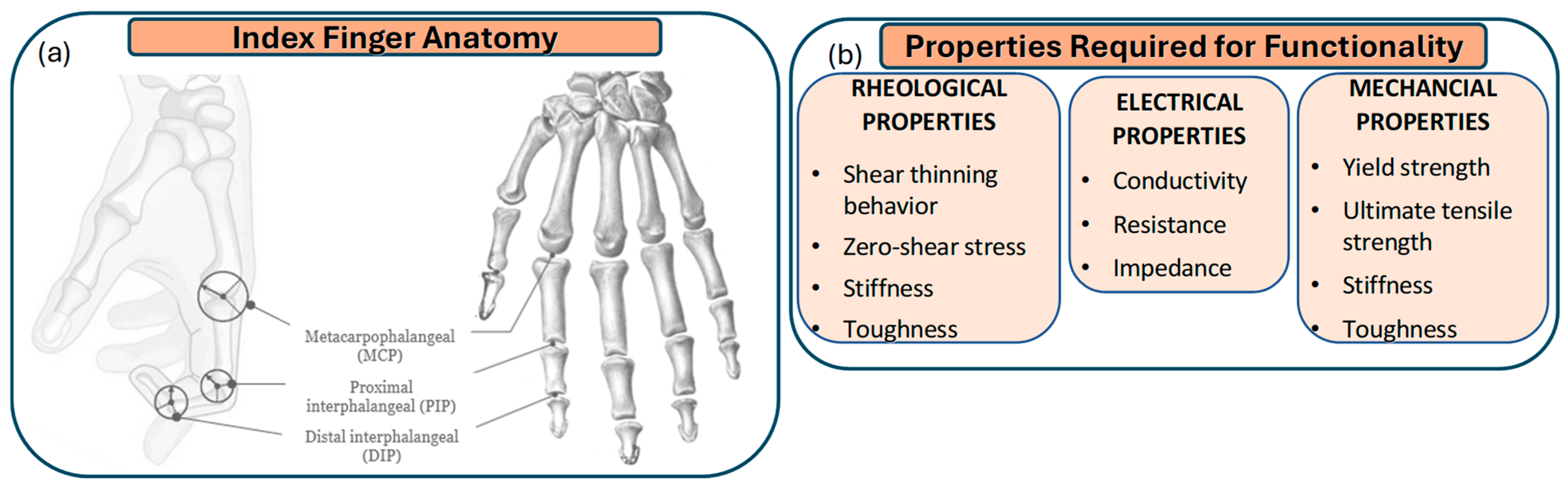 b) essential rheological, electrical, and mechanical properties for prosthetic functionality.