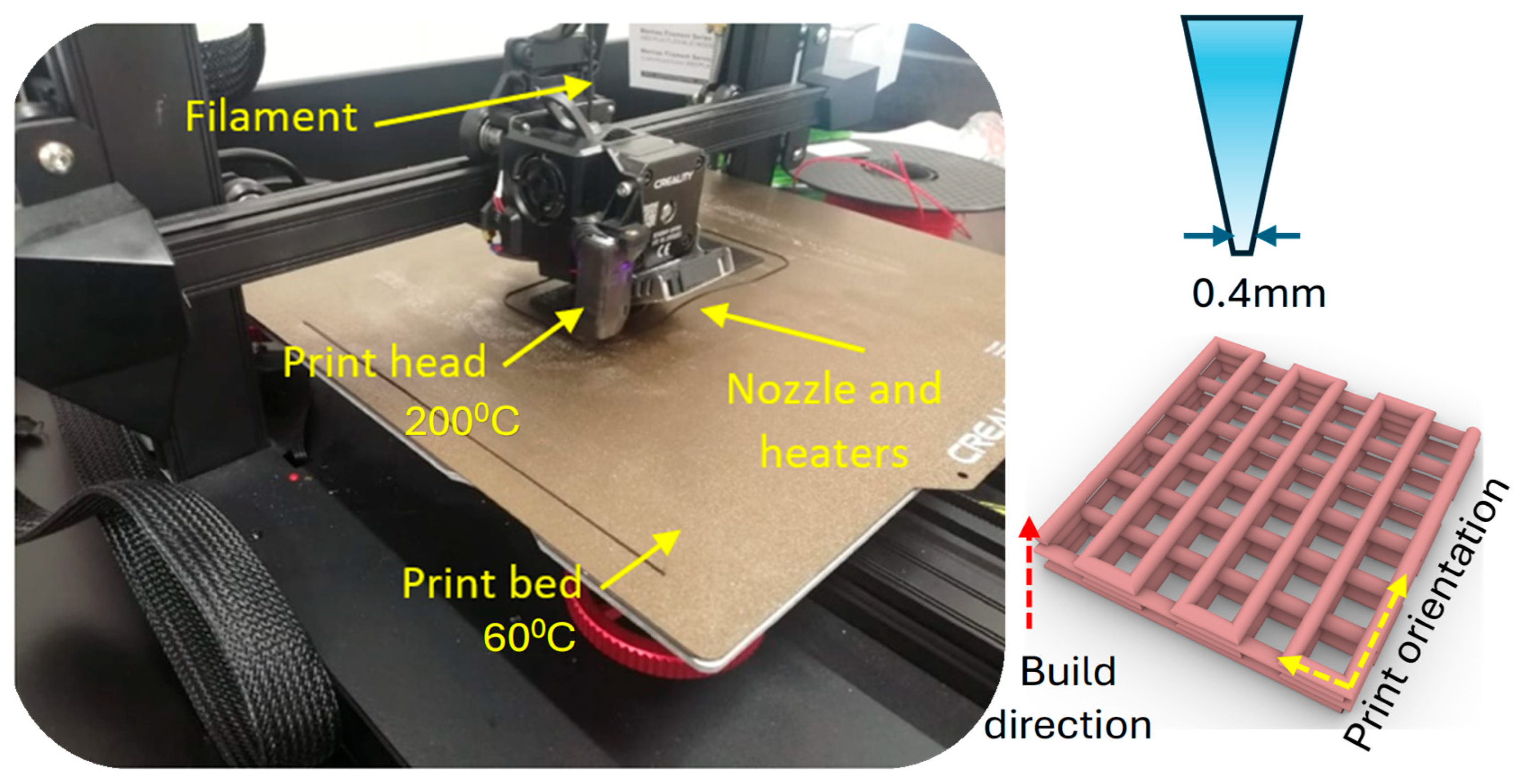 Components and print orientation in FDM 3D printing: The key components of an FDM 3D printer, including the filament, heated print head (200 °C), nozzle, and print bed (60 °C), along with a schematic of the print orientation and build direction for a structure.