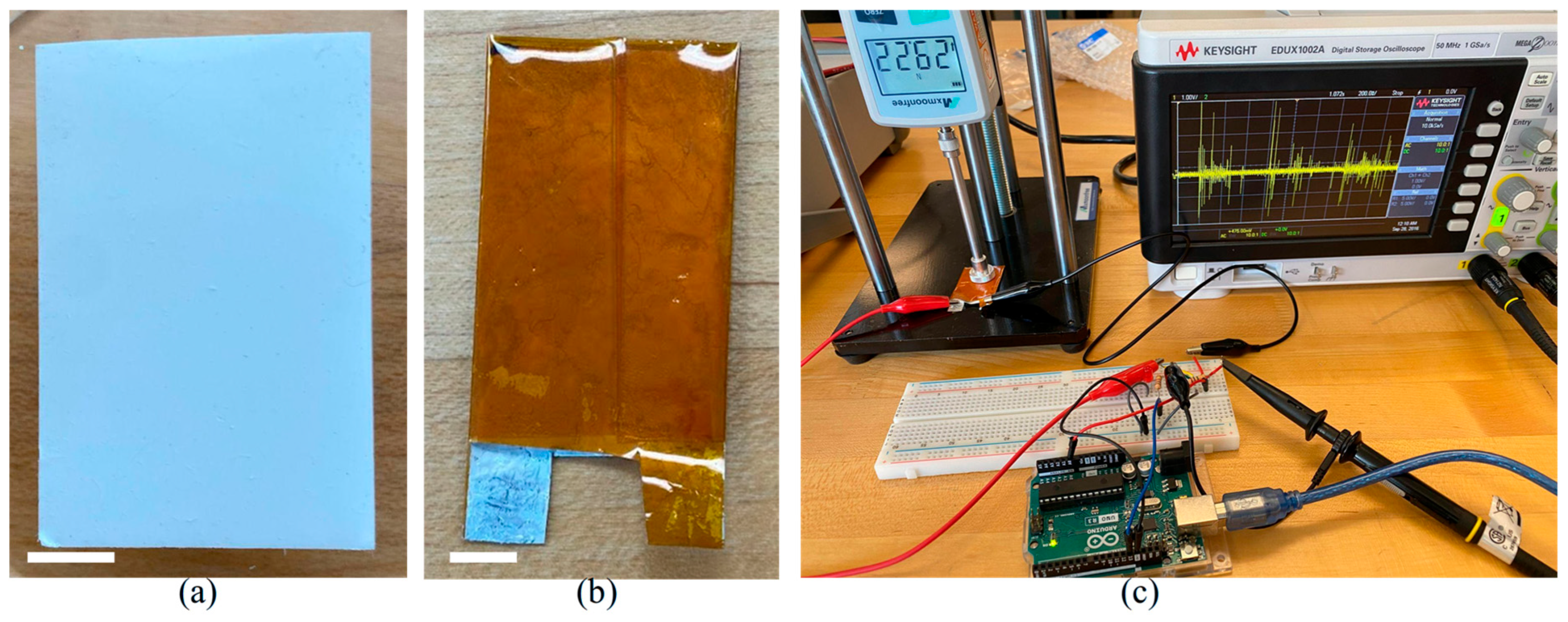 Fabrication and testing of sensor-integrated systems: (a) Sample fabricated with 10:1 PDMS-40% BaTiO3, (b) constructed assembly of Kapton tape, silver ink, and the 10:1 PDMS-40% BaTiO3 composite, and (c) testing setup for the sensor involving a force gauge, an oscilloscope, and an Arduino Uno. Scale = 1.0 mm.