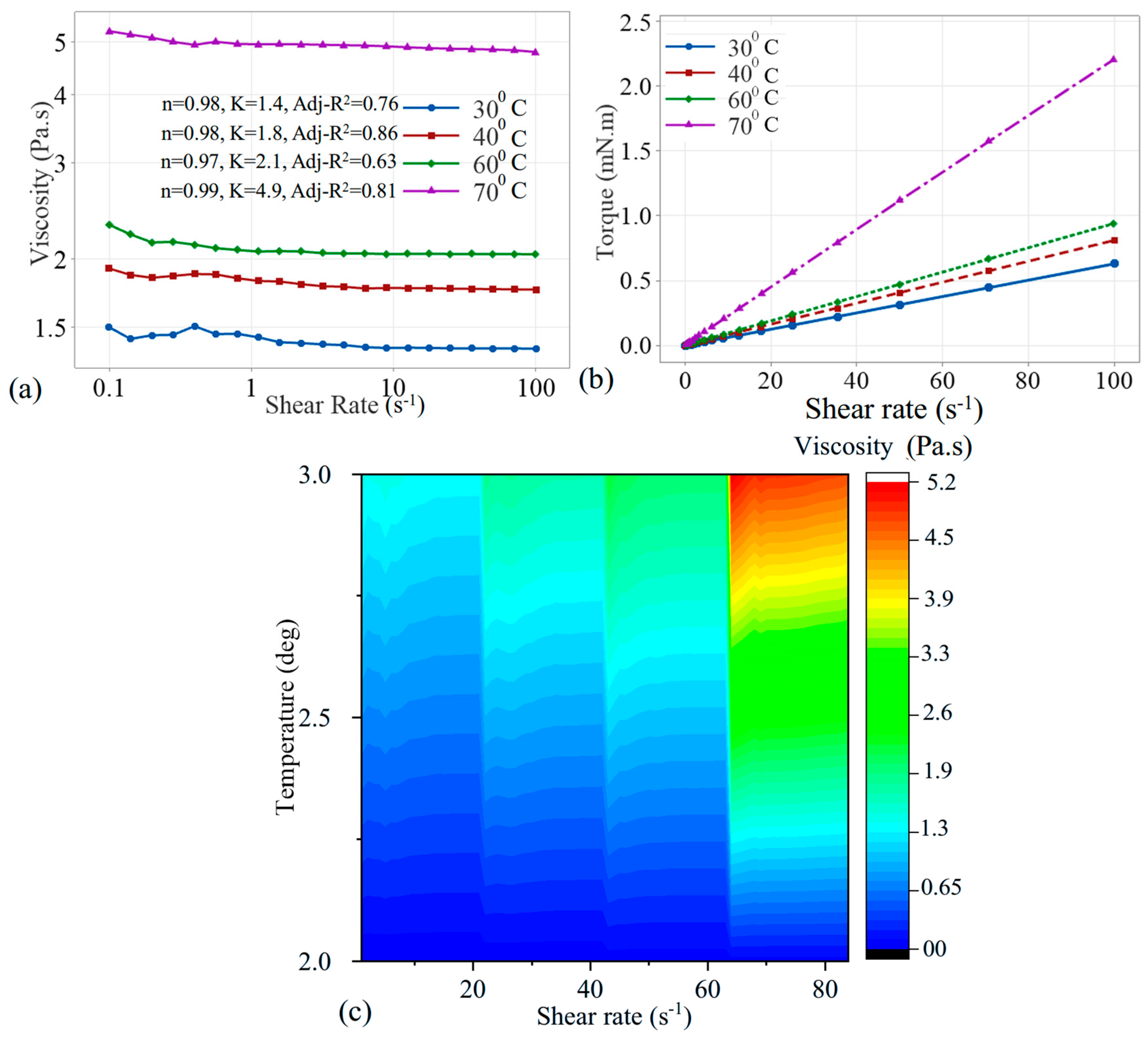 Flow behavior with respect to (a) viscosity, (b) shear stress of 10:3 PDMS composition at various temperatures (°C), e.g., 30 °C, 40 °C, 60 °C, 70 °C, and (c) viscosity distribution of PDMS with respect to shear rate and temperature.