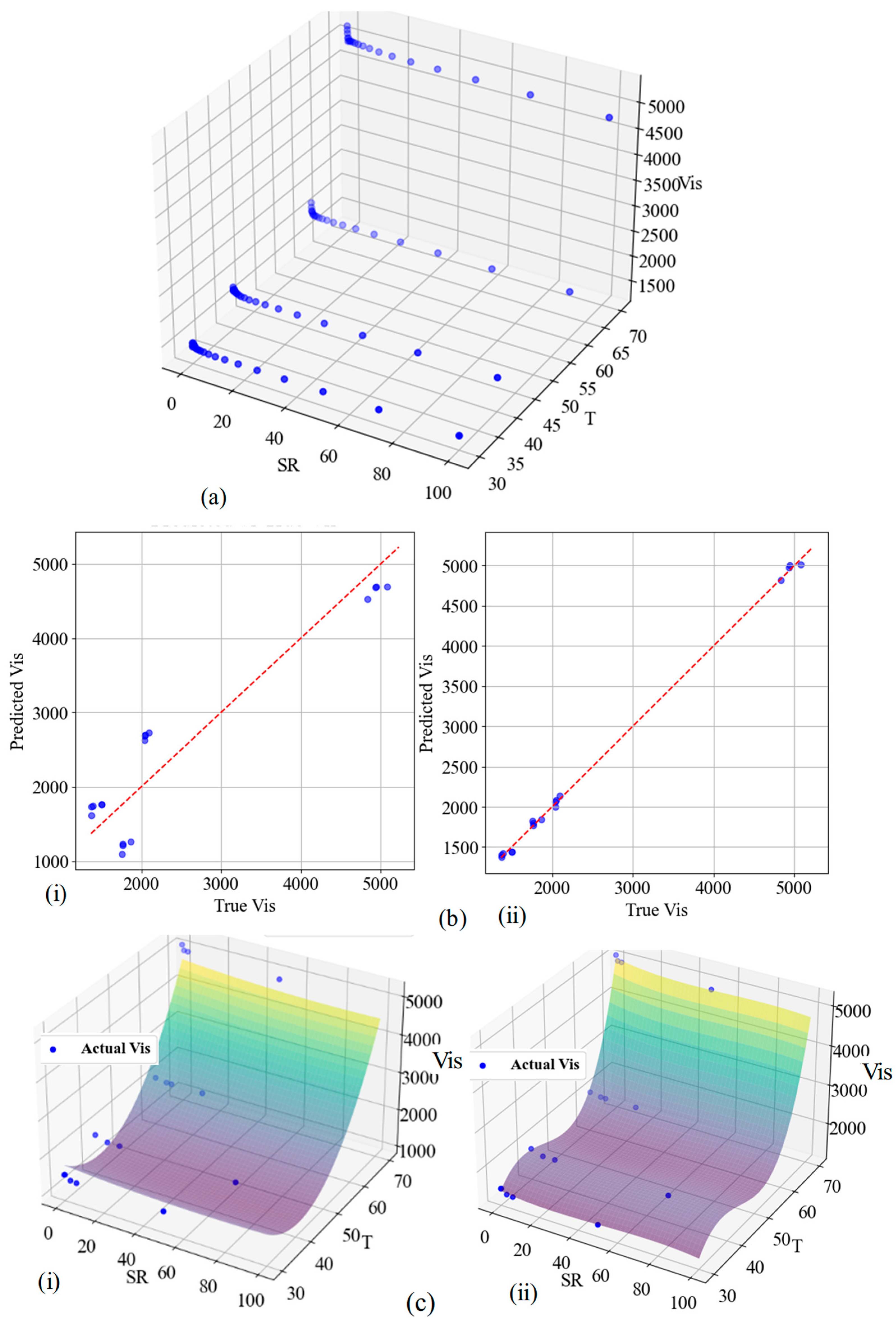 (a) The 3D distribution of actual viscosity with the change in shear rate and temperature, (b) true viscosity versus predicted viscosity obtained from the predictive model of viscosity as a function of shear rate and temperature for (i) second-order polynomial model and (ii) third-order polynomial model, and (c) predictive surface of viscosity with respect to shear rate and temperature for (i) second-order polynomial model and (ii) third-order polynomial model. , and , .