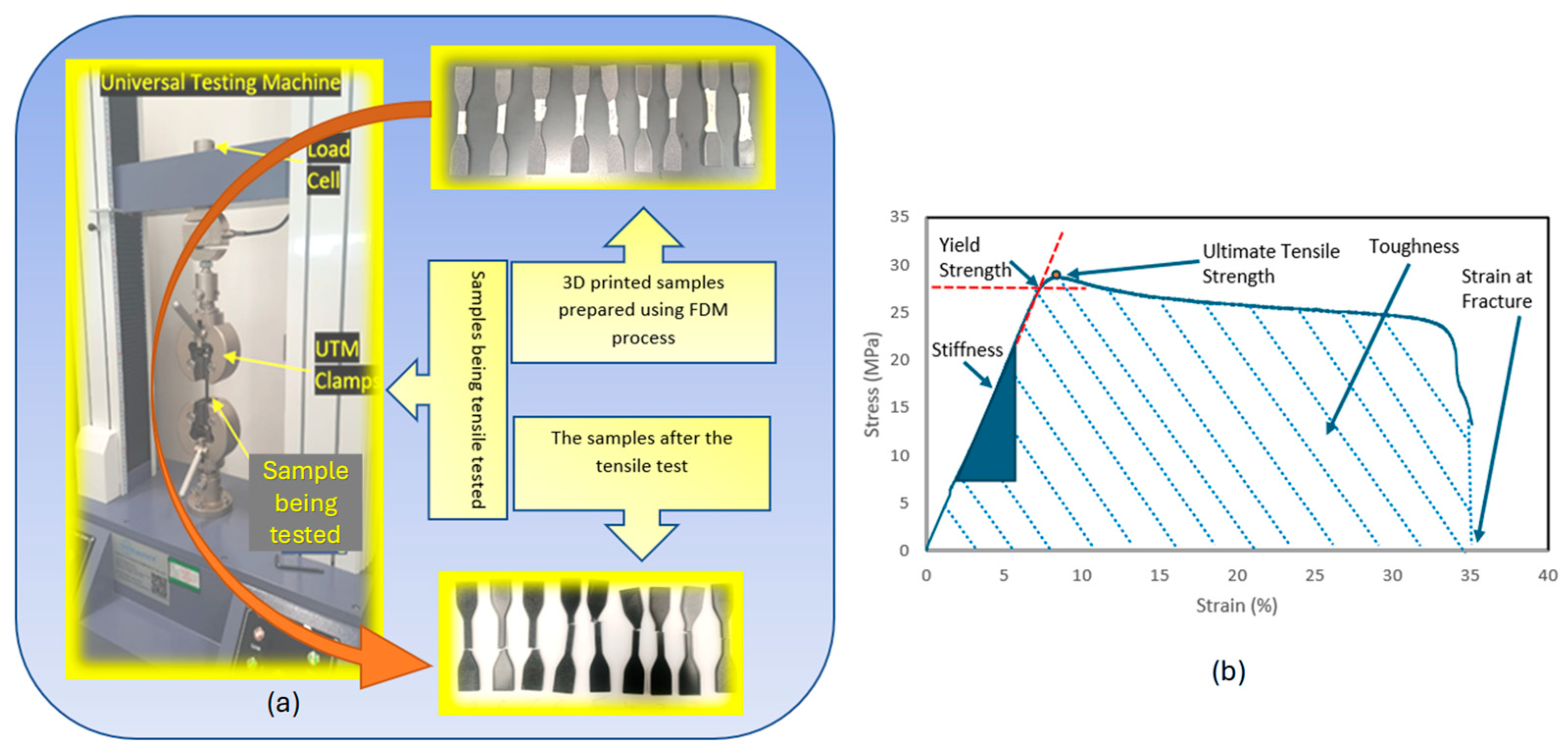 (a) Universal testing machine performing the tensile test on PLA sample: the prepared samples, their placement in UTM clamps, and the results post-tensile testing, emphasizing the evaluation of mechanical properties; (b) first replication of Sample 1 after testing stress strain diagram: This figure depicts a stress–strain curve highlighting key mechanical properties, including yield strength, ultimate tensile strength, stiffness, toughness, and strain at fracture.