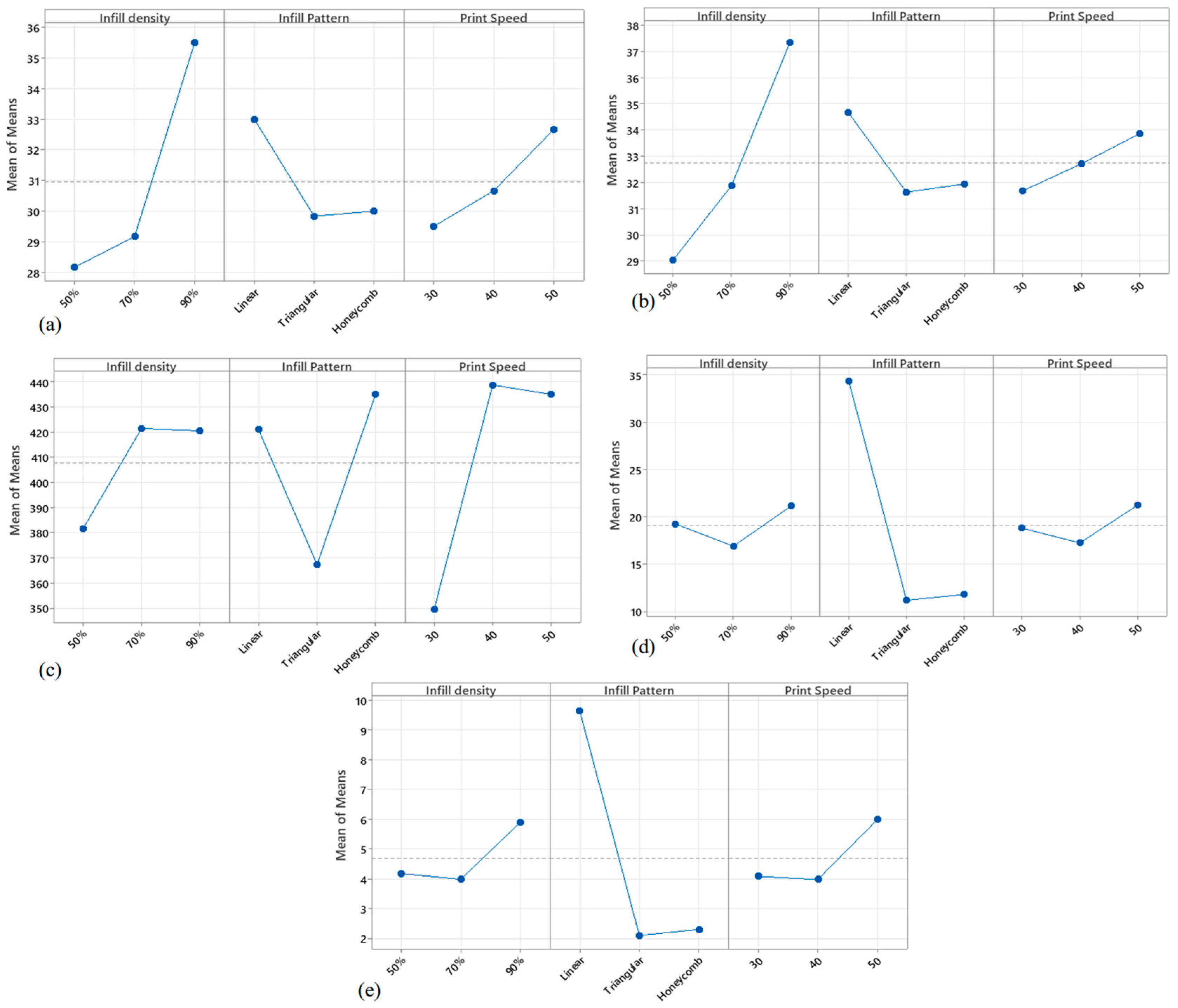 Influence of infill density, pattern, and print speed on 3D printing outcomes. The graphs illustrate the effects of varying infill density, infill pattern, and print speed on key 3D printing parameters, providing insights into optimizing print quality and structural properties through statistical analysis of mean performance metrics: Mean effect plots for (a) Yield strength (MPa), (b) Ultimate tensile strength (MPa), (c) Stiffness (MPa), (d) Strain at fracture (%), and (e) Toughness (MJ/m3).