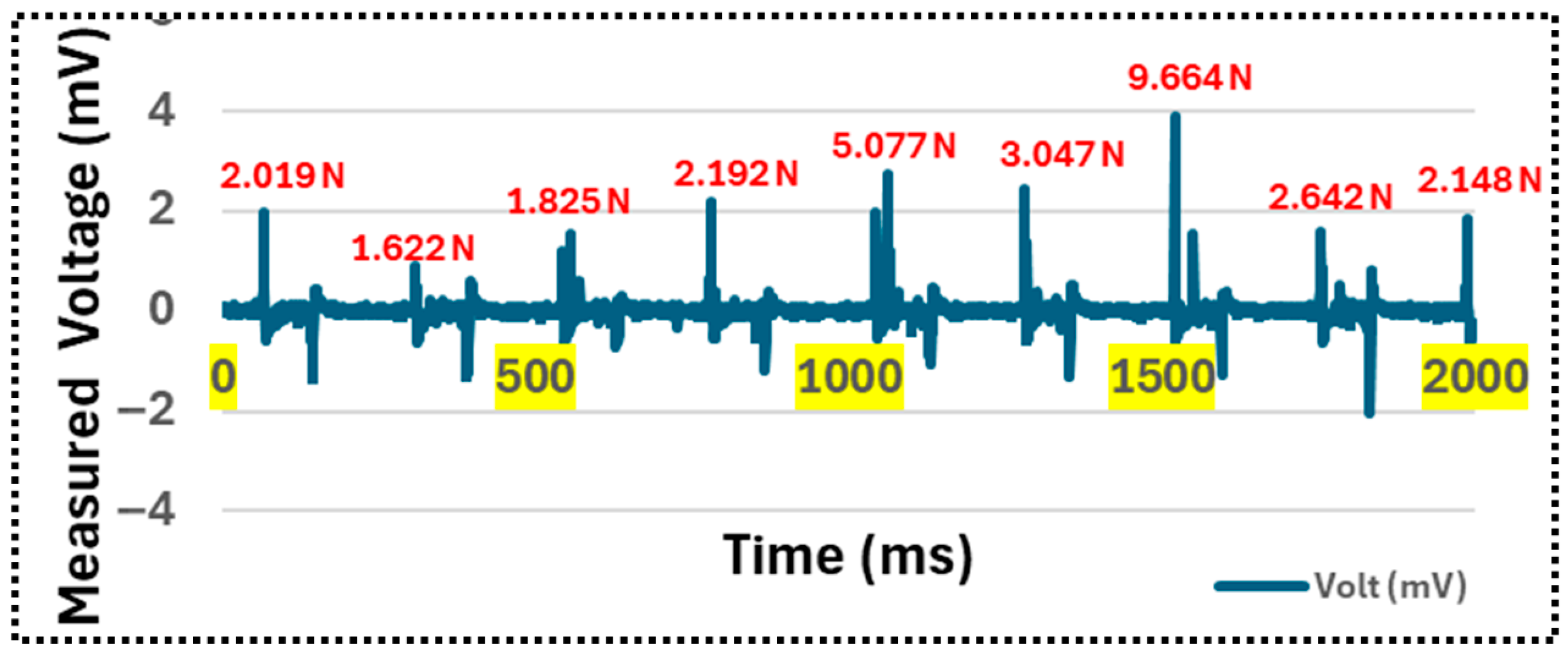 The measured voltage (mV) over time (ms) corresponding to different applied forces (N). The piezoelectric sensor demonstrates distinct voltage peaks at specified force intervals, showcasing its responsiveness to applied mechanical loads.
