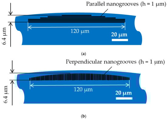 S. Maeng et al. [42] have researched nanogrooves as textures on the rake face of PCD tools without lubrication to reduce the coefficient of friction in ultra-precision machining of tungsten carbide (WC, hard alloy). The PCD tool had an edge radius of 350 nm when the waviness of the cutting edge was 203 nm. The authors expected that the low value of the coefficient of friction would reduce the thermal load (heat) between the tool and workpiece and thereby extend the operational life of the cutting tool. The nanogrooves were produced by a focused-ion-beam method parallel and orthogonal to the cutting edge. The processing factors are presented in Table 2. The perpendicular textures comprised eight grooves with the following parameters: width (w) of 0.8 μm, depth (h) of 1 μm, pitch (spacing, s) of 1 μm, and length (l) from 35 to 120 µm (Figure 3a). The pattern was at a distance (m) of 2 µm from the cutting edge with the width of the textures (wt) of 6.4 µm. The parallel grooves were engraved at the same distance from the cutting edge (m), length (l), and width (wt), and with the same groove parameters (w, h, s) to provide a similar area of textures on the rake face (Figure 3b). The texture length in the cutting direction was equal to the length of the contact pad between the tool and the workpiece. It was observed that the coefficient of friction of the cutting tool with the perpendicular-textured tool was decreased by 10%, and for the parallel-textured one, by 7%. The surface roughness parameter Ra varied from 130 to 220 nm for perpendicular nanogrooves and from 140 to 195 nm for parallel nanogrooves, with Ra in the range of 145–205 nm. Thus, the better result in the context of the final product surface quality has demonstrated that with the parallel nanogrooves, Ra was improved by 3.44–4.87%. This effect can be called insignificant on the considered scale, but it shows that the parallel pattern of the grooves is preferable over the perpendicular one.