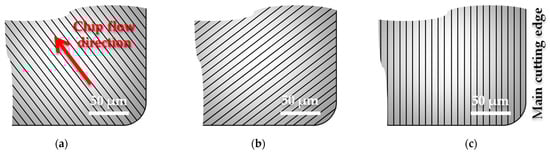 Graphical presentation of the micro/nanotextures on the rake face of the PCD cutting insert produced by fiber laser: (a) parallel to the chip flow direction (at 135° to the main cutting edge); (b) perpendicular to the chip flow direction (at 45° to the main cutting edge); (c) parallel to the main cutting edge (0°).