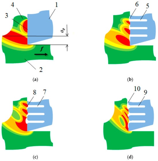 Illustration of the simulation results of the temperature fields and features of chip flow in cutting homogenous material with a cutting tool, where the gradation of colors indicates the temperature fields from 20 °C to 550–580 °C: (a) without microtextures; (b) with rectangle profile in plan microtextures; (c) with microtextures with a chamfer; (d) with microtextures with rounded edges, where f is a feed direction (indicated by an arrow), ap is a cutting depth (indicated by dimension lines), (1) is a cutting tool, (2) is the homogenous material of the workpiece, (3) is an area of the contact between the cutting tool and workpiece (contact pad), (4) is the formation of the chip, (5) is a rectangle in plan microtexture, (6) is the formation of the gap between the cutting tool and workpiece, (7) is the microtexture with a chamfer, (8) is extrusion of the material into the kerf, (9) is a microtexture with round edges, (10) is the absence of contact between the cutting tool and workpiece (stable gap).