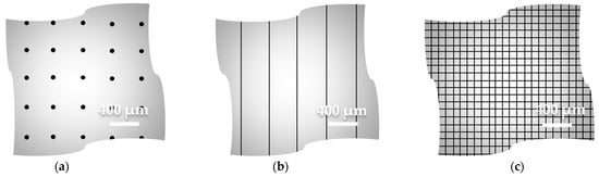 Graphical presentation of the microtextures on the PCD sample produced by femtosecond laser: (a) microholes; (b) microgrooves; (c) micronodes (cross-hatching).