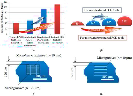 G. Sakthivel et al. [37] investigated textured PCD with lyophobic wettability for turning Al6061 alloy to enhance anti-friction and self-lubrication properties. The experiments were produced in dry conditions. Lyophobic wettability was formed using an amine silane on the textured surface, which was produced on the PCD tool by the ND:YAG laser. The combination of texturing and lyophobic solution significantly improved the cutting tool’s performance.
