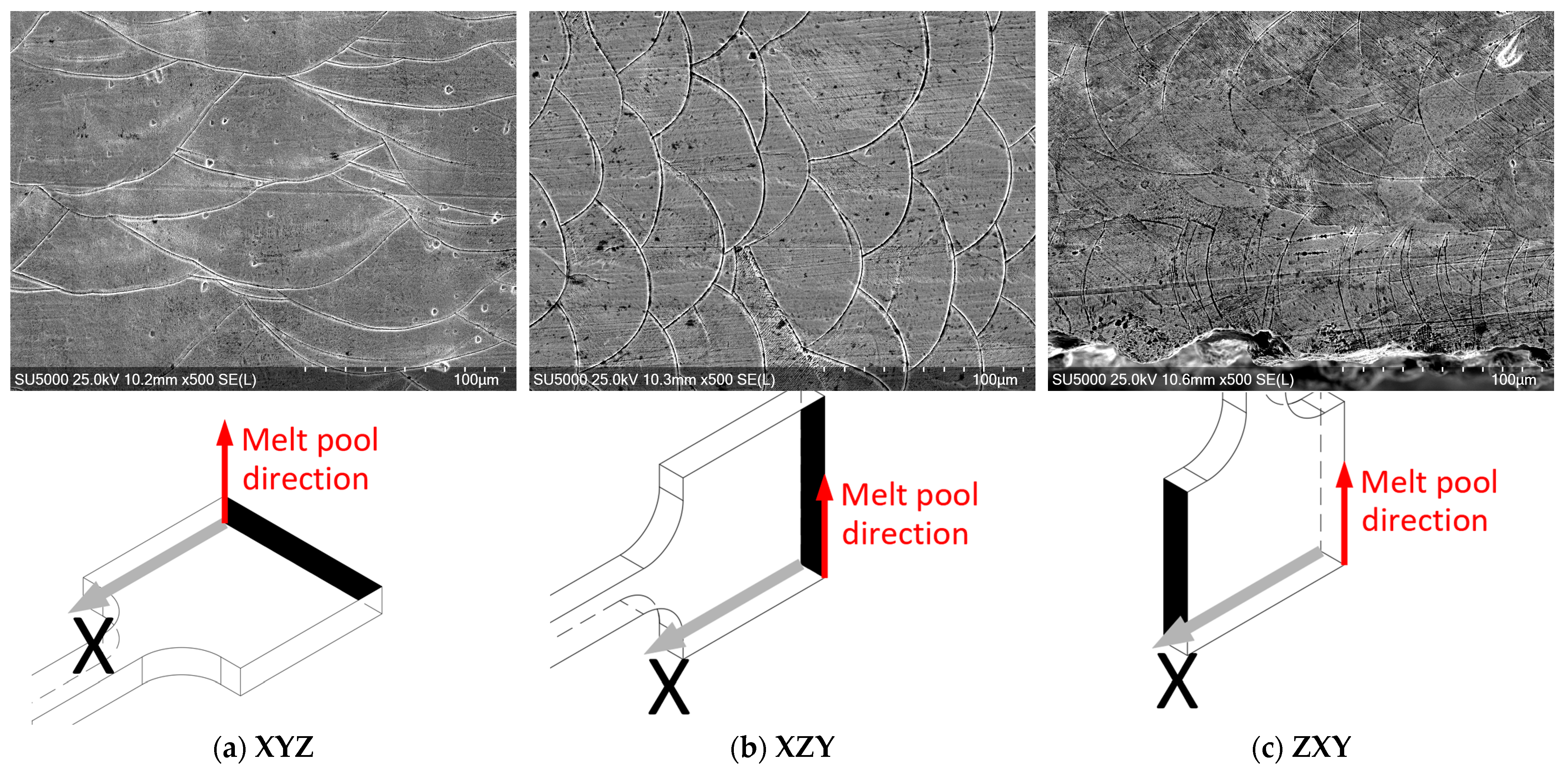 - Shifeng, W.; Shuai, L.; Qingsong, W.; Yan, C.; Sheng, Z.; Yusheng, S. Effect of Molten Pool Boundaries on the Mechanical Properties of Selective Laser Melting Parts. J. Mater. Process. Technol. 2014, 214, 2660–2667. [Google Scholar] [CrossRef]