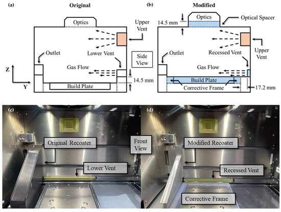 (a) Side-view illustration of the original chamber configuration; (b) side-view illustration of the modified chamber configuration, highlighting component modifications (excluding recoater); (c) front view of original chamber configuration, with upper and lower vents highlighted in yellow; (d) front view of modified chamber configuration, with upper and lower vents highlighted in yellow.