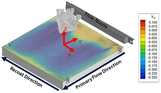 Moran et al. [26] evaluated defect formation across the entire build plate of an EOS M290 and identified higher defect volume in the region closest to the inlet vent. It was observed, through CFD simulation, that gas flow recirculation occurred in this region, and they concluded that the formation of eddies was the main factor behind the high volume of defects. A previous study, Elkins et al. [27], focused on the experimental analysis of flow distribution within the EOS M290 through Magnetic Resonance Velocimetry (MRV), revealed that this region of recirculation was directly related to the step (in the Z-axis) separating the inlet vent from the build plate. An additional vent was introduced to create a uniform flow field, and single scan tracks were produced using both the original and the modified configurations. It was found that, without the extra vent, melt pools near the inlet vent were shallower than others; on the other hand, using the extra vent resulted in more consistent melt pool depth. These results demonstrated once again the importance of maintaining a unidirectional flow field to prevent the formation of anomalies. Additionally, it was theorized that, in this specific case, the gas flow distribution could be improved significantly by removing the separation (in the Z-axis) between the inlet vent and the build plate surface, since that was the main contributor to the formation of the backward-facing step flow observed near the vent. Similar conclusions regarding the detrimental role of gas recirculation, stagnation zones, and non-uniform gas speed have been reported in chamber-scale measurements and simulations, which document large spatial variations in velocity and associated regions of soot and condensate accumulation over the build plate [28,29,30].
