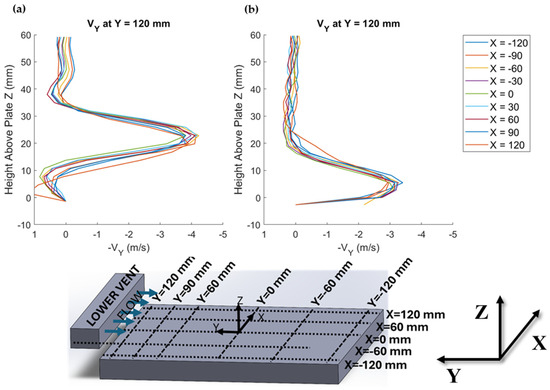 Vertical profiles of scaled gas flow velocity in the Y direction (VY) near the lower inlet vent, taken across the width of the build plate in the X direction. Note negative Y is in the primary flow direction. (a) Original chamber configuration (OEM); (b) modified chamber configuration (MOD).