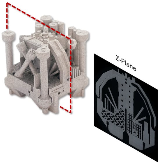 As stated before, qualification test artifacts were built to provide a holistic insight into how the different flow conditions affect part quality and potential defect formation in complex geometries built with metal powder; Figure 8 depicts one of the artifacts manufactured as part of the experiment, as well as the approximate location of the Z-plane analyzed for the study. Only one artifact was built for each flow configuration (see Figure 3 for the location of the artifact on the build plate), and therefore, the artifact results reported in this study are preliminary and are to be used for more holistic and qualitative comparisons of part quality between flow configurations. However, they do provide clues as to the influences flow can have on part quality and performance.