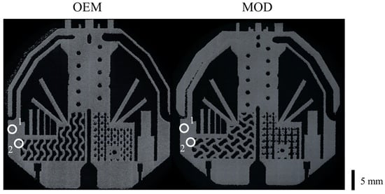 Zoomed-in view of regions 1 and 2. Large spatter ejecta can be seen in the OEM artifact, while no equivalent anomalies were identified on the MOD artifact.