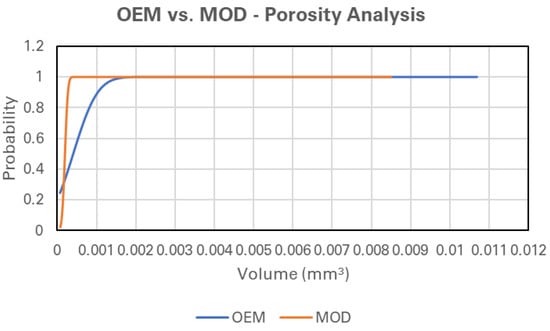 Further analysis through cumulative distribution functions (Figure 12) reinforces this interpretation, as it demonstrates a noticeable difference between both datasets, with the modified configuration displaying significant improvement over the original. The curve for the OEM arrangement rises gradually, indicating that the samples within the dataset have a larger spread, which directly translates to greater variation in porosity size. The curve representing the MOD dataset, on the other hand, rises sharply and approaches a probability of 1 at a volume of 0.493 × 10−3 mm3; in the case of the OEM curve, a similar volume is achieved with a probability of 0.57. This indicates that the vast majority (99%) of all samples in the MOD dataset fall below 0.493 × 10−3 mm3, whereas over 40% of OEM samples exceed this threshold, highlighting a higher pore volume when utilizing the OEM configuration. These results, while preliminary, support the initial argument that improved gas flow characteristics, achieved through the modification of the chamber, contribute to a more stable and controlled melt pool, as described in Section 3.3.