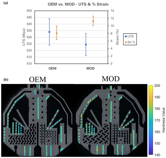 Comparison of mechanical properties between OEM and MOD artifacts. (a) UTS and % strain at break. (b) Vickers hardness at different positions of the Z-plane.