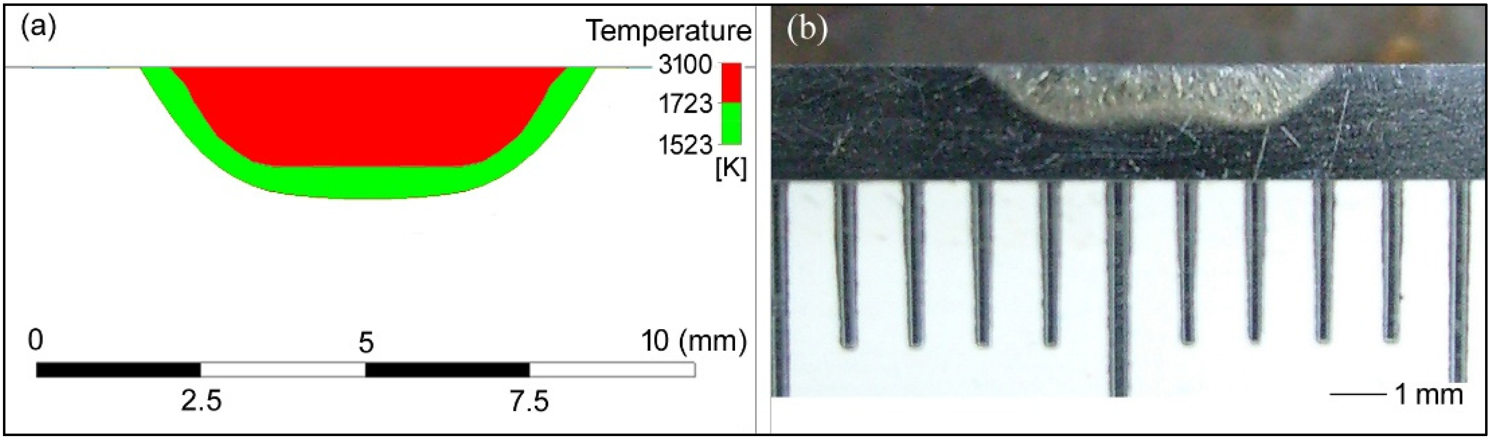 -shaped” experimental weld pool observed in this research. This critical temperature was chosen following several numerical experimentations that involved testing the temperature range from 2000 K to 3000 K with an increment of 100 K. The shape of the pool depth was considerably different when other critical temperatures were employed.2.3. Modeling of the Moving Weld Pools