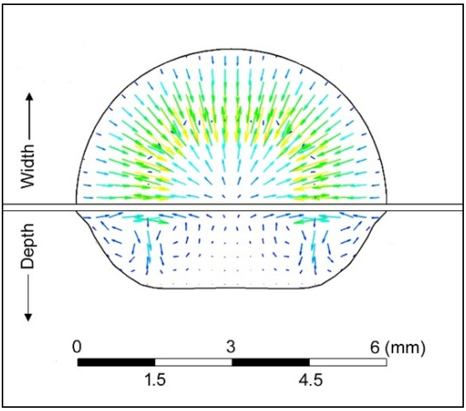 -shaped weld pool was created where the opposing vectors converged and pushed down to deepen the pool at that location. This trend resembles the results investigated by Xu et al. [46], thereby confirming the numerical model. This same model was then modified, and various investigations were performed in this research.5. Results and Discussion